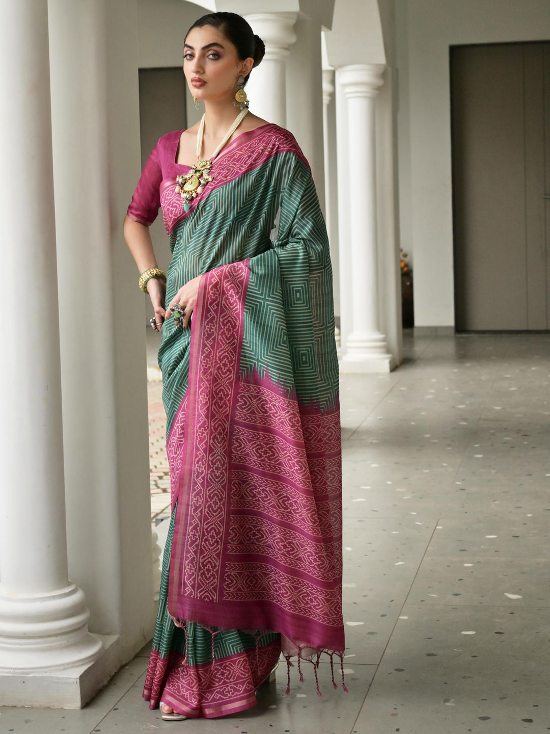 Green, Pink and Majenta color Saree in Tussar Silk fabric with Printed work