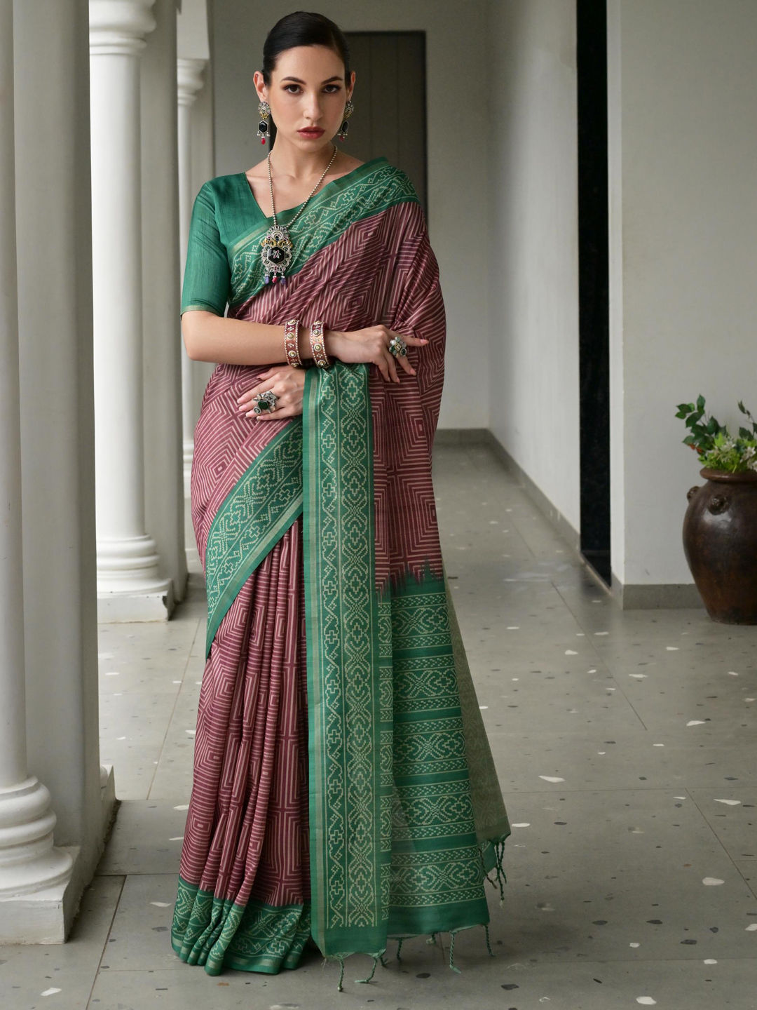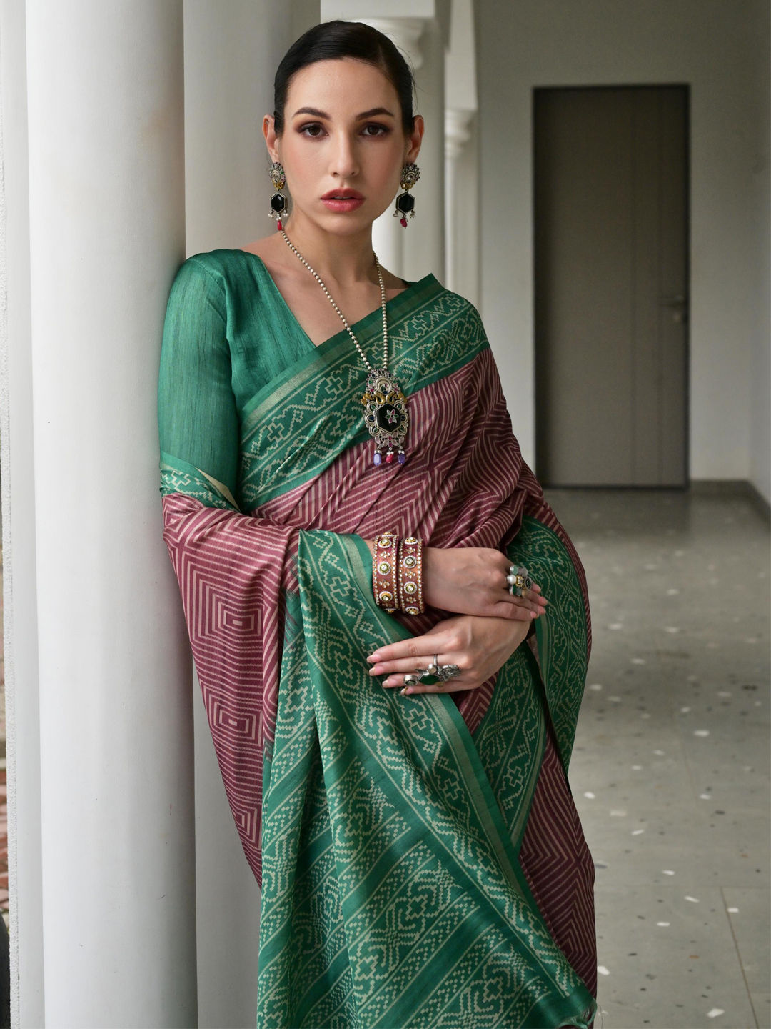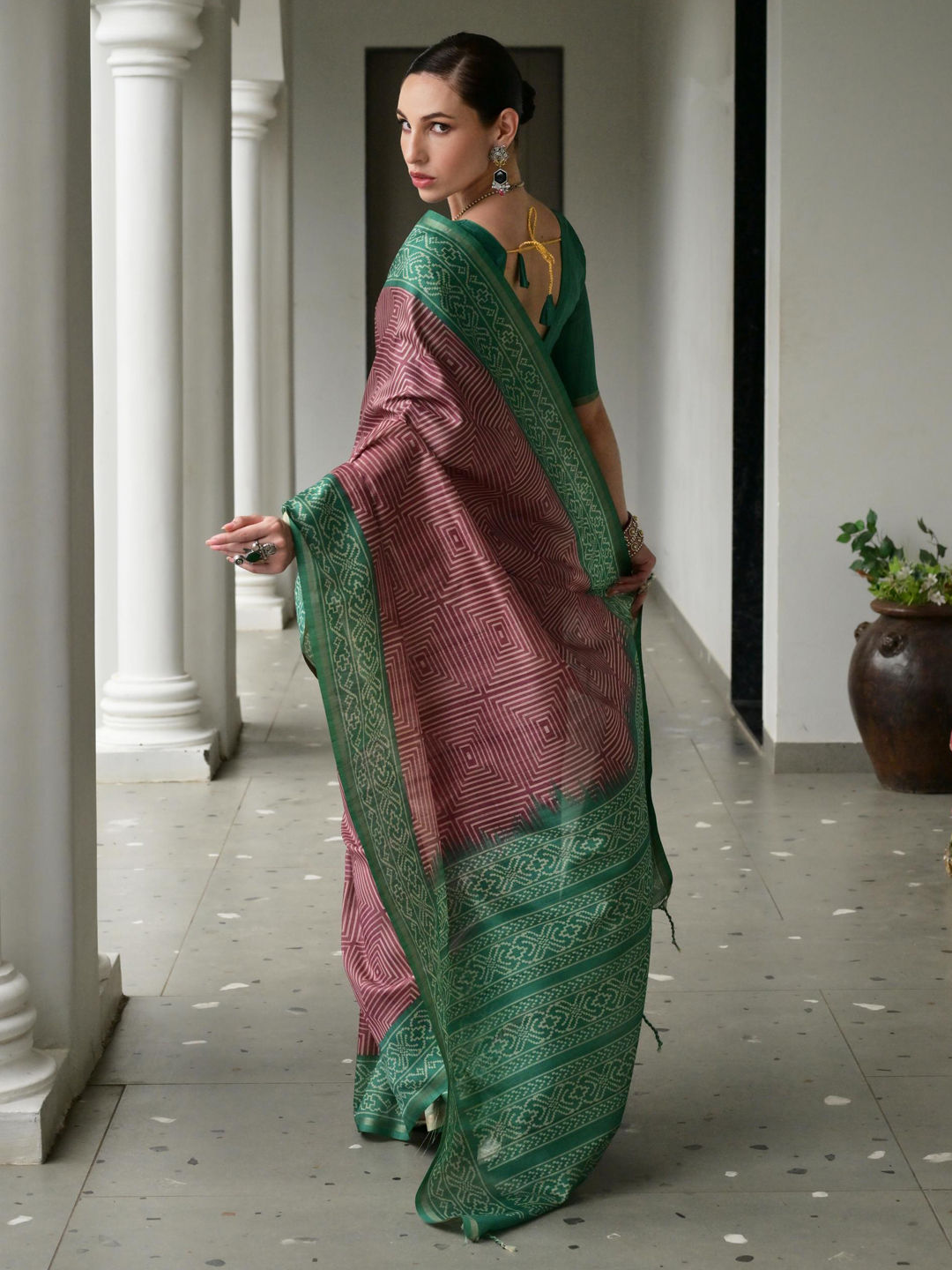 Green, Red and Maroon color Saree in Tussar Silk fabric with Printed work