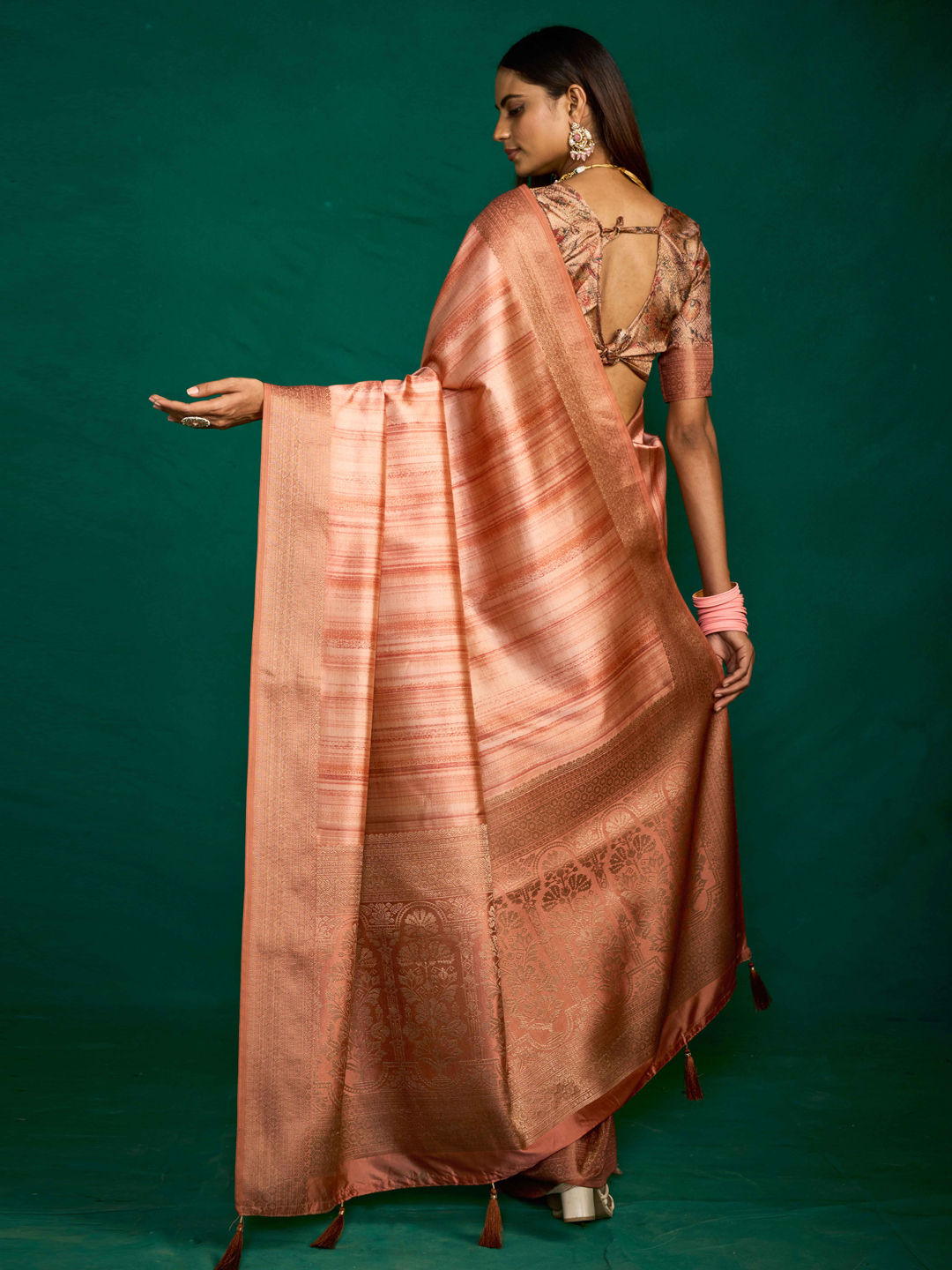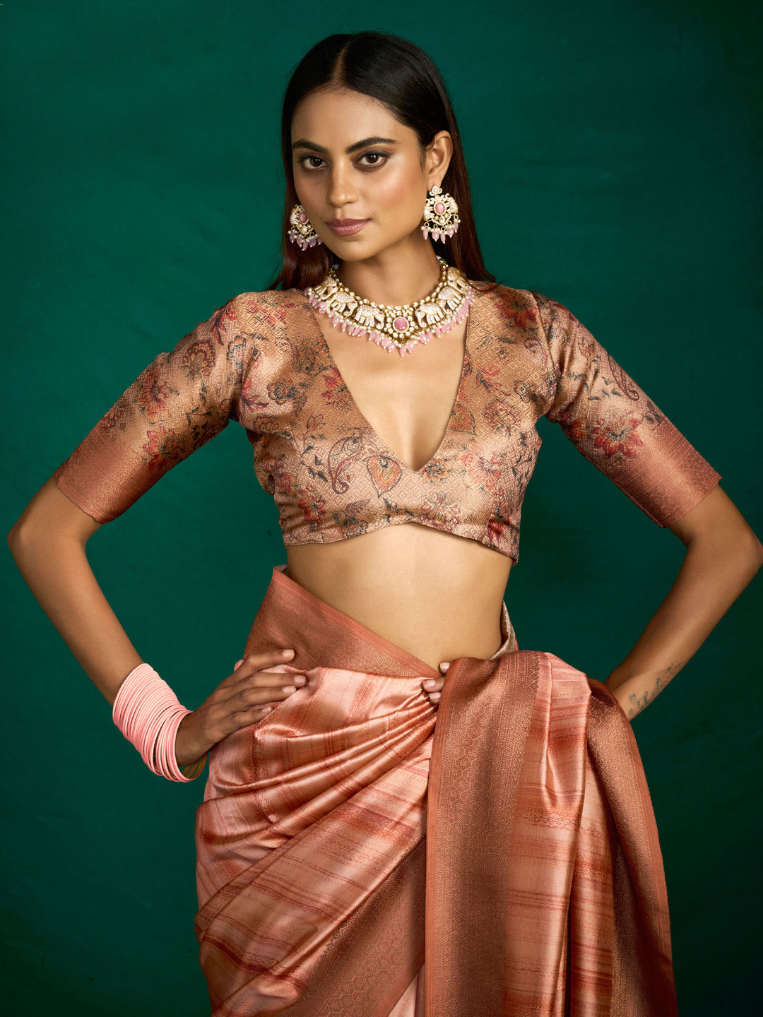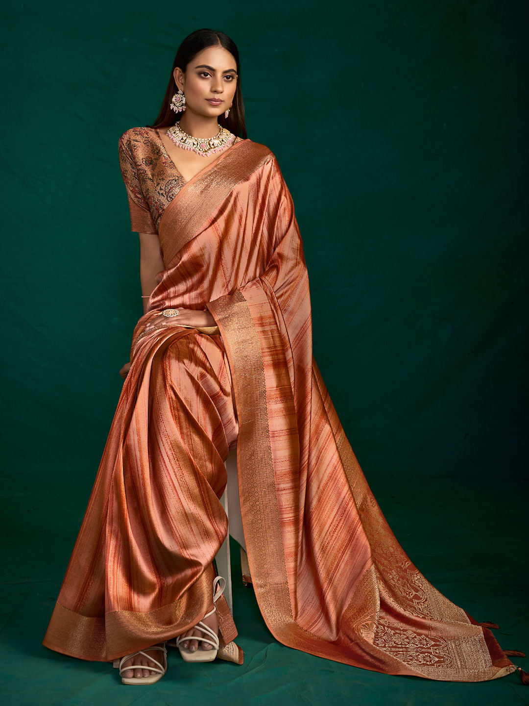 Orange color Saree in Tussar Silk fabric with Digital Print, Weaving work