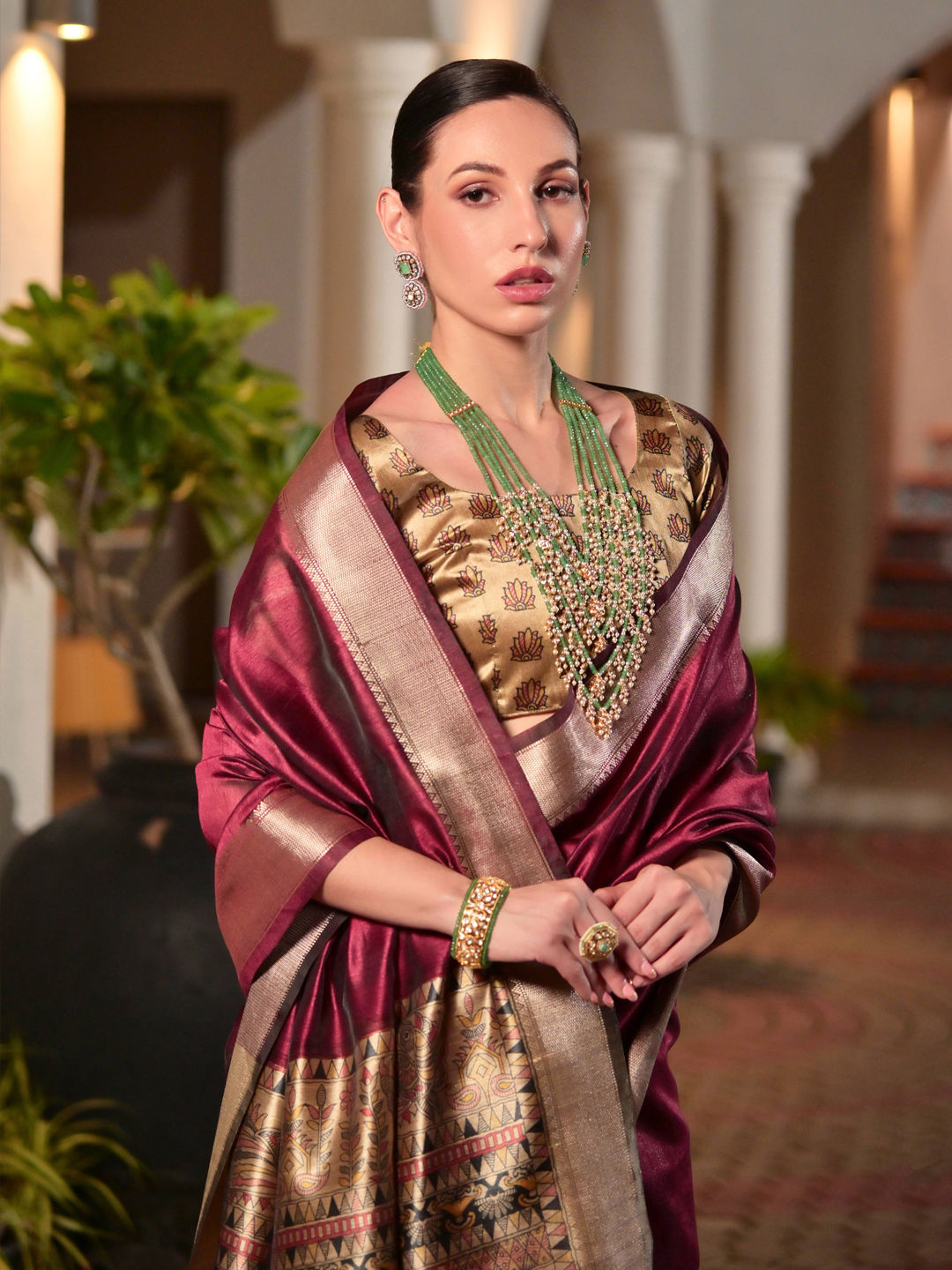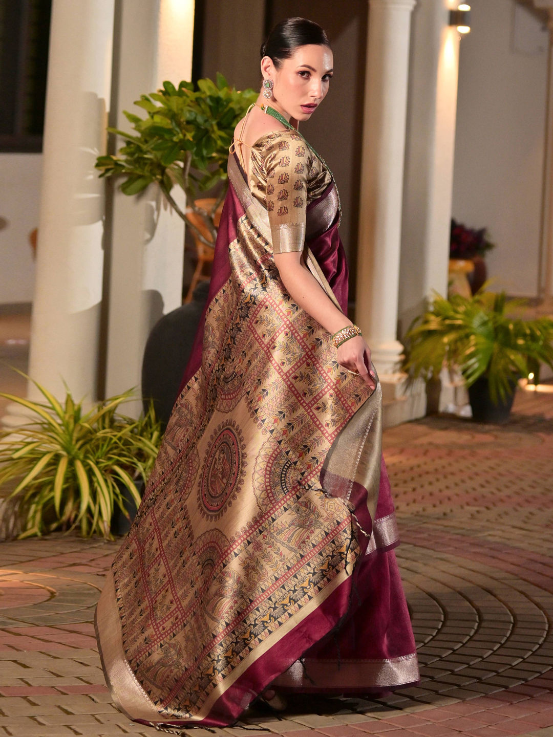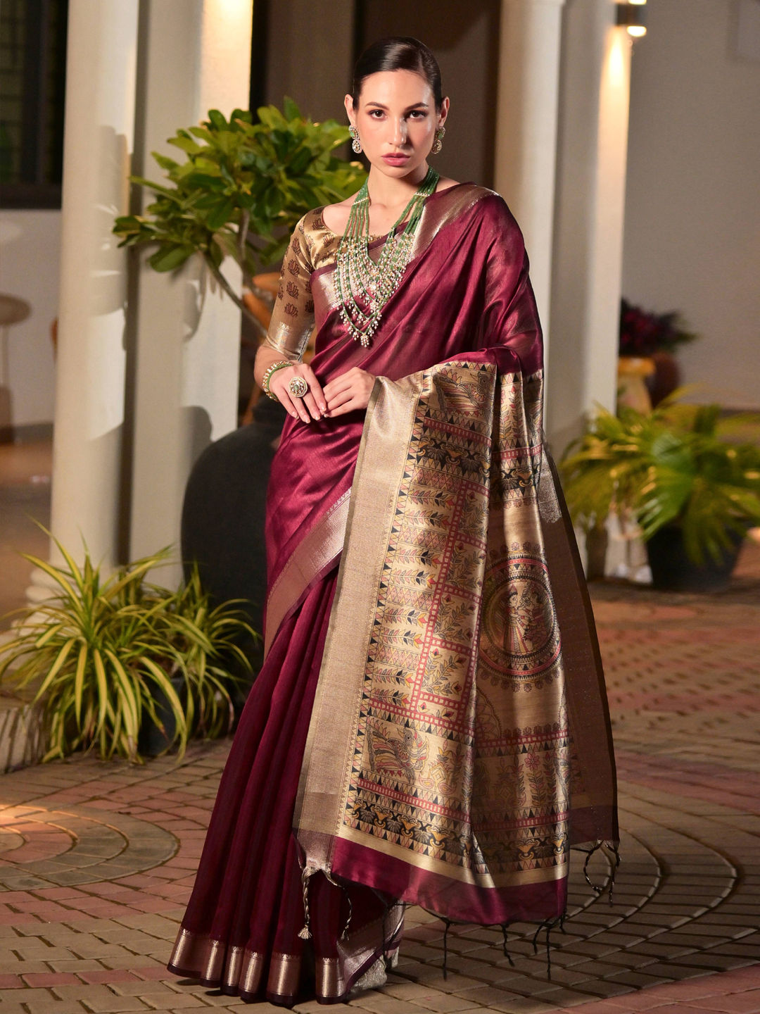 Red and Maroon color Saree in Tussar Silk fabric with Border, Zari work