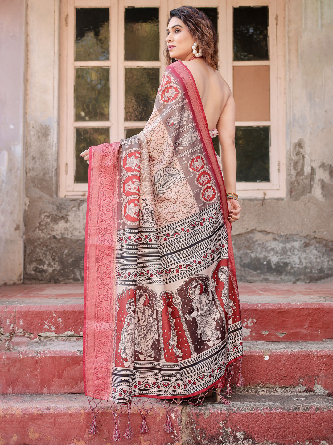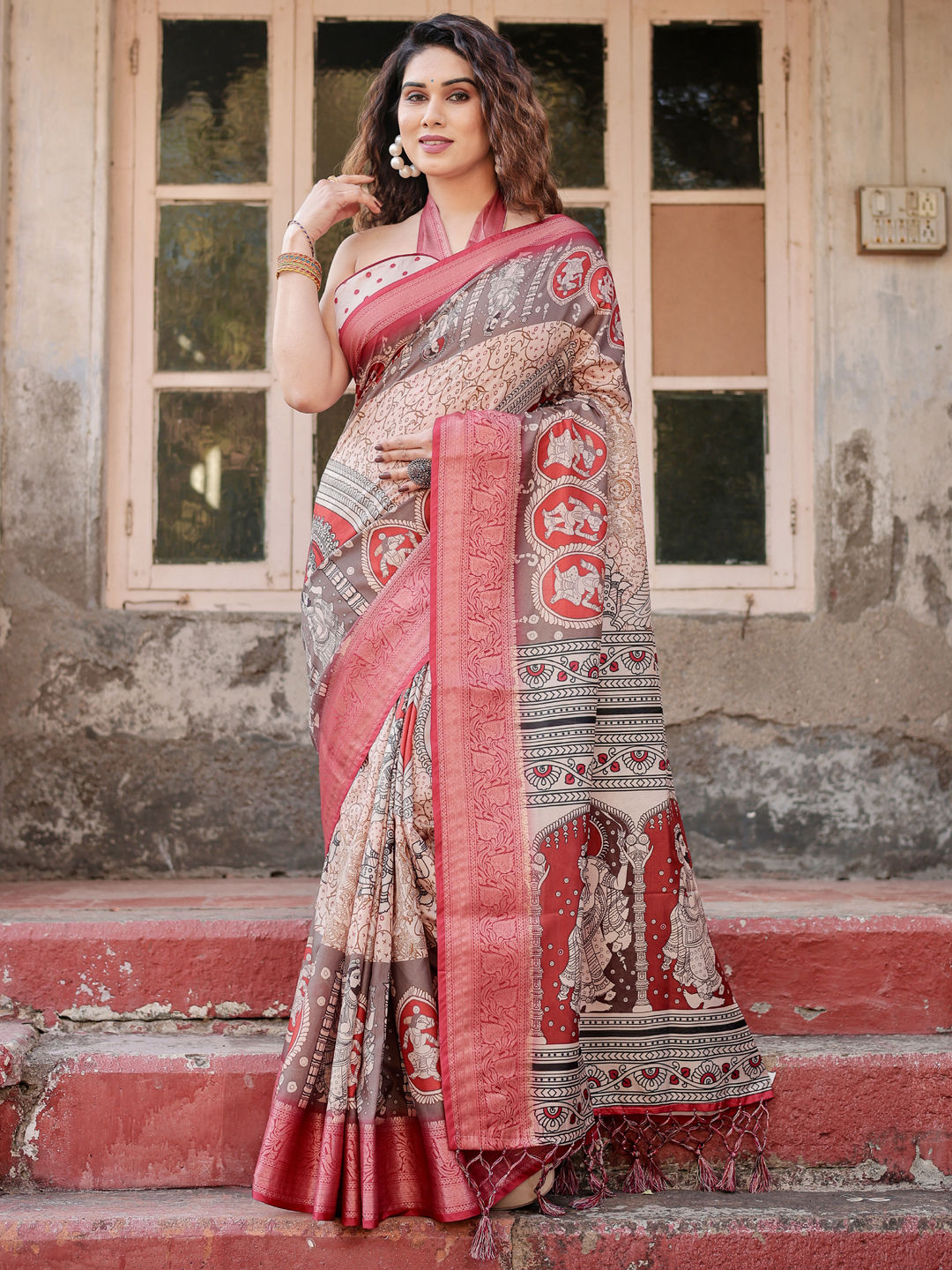 Tussar Silk Festive Saree in Red and Maroon with Printed work