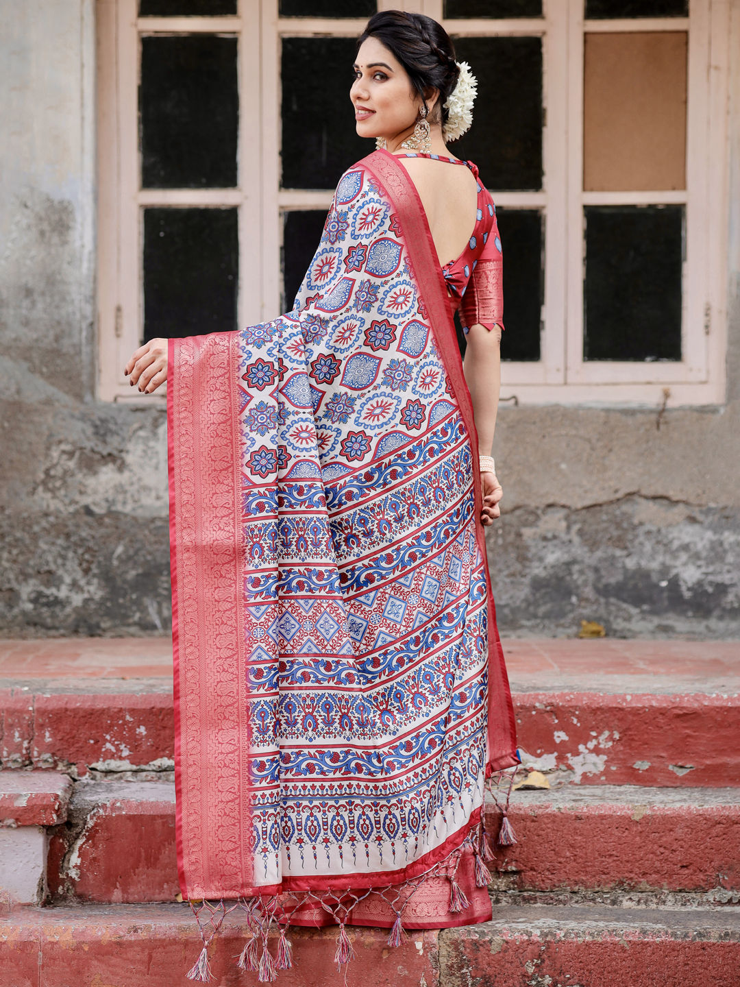 Tussar Silk Festive Saree in Red and Maroon with Printed work