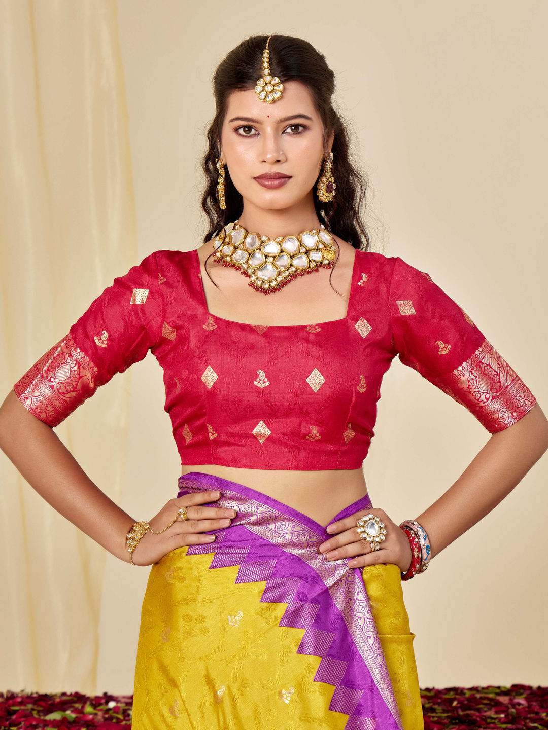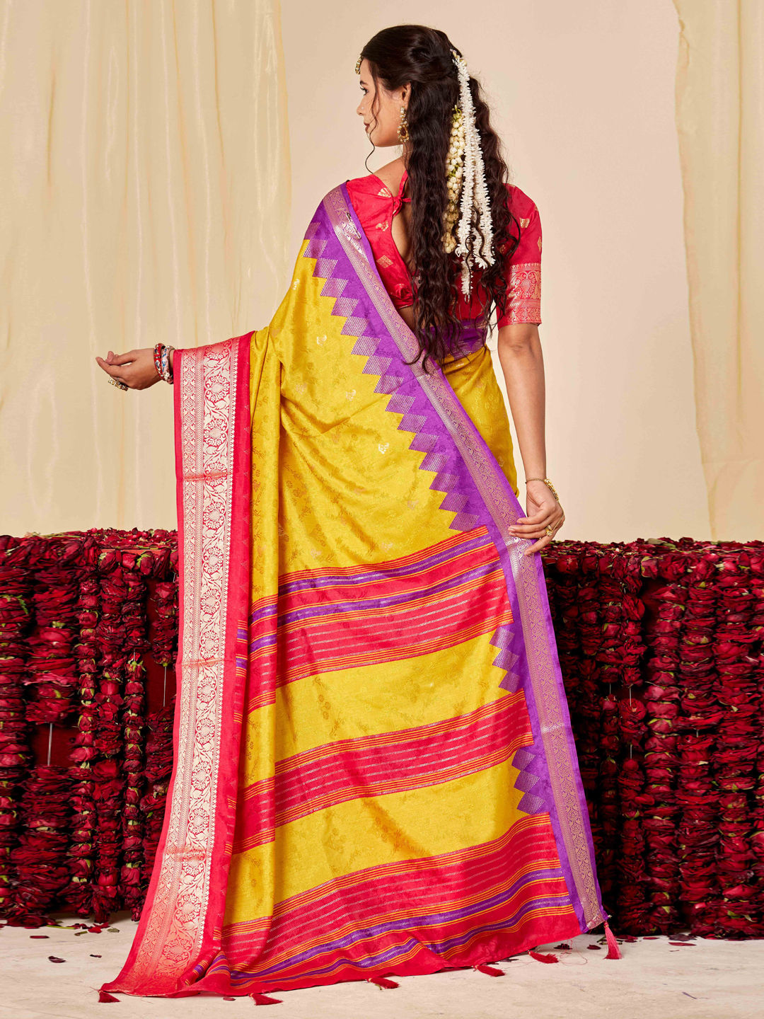 Yellow color Saree in Tussar Silk, Velvet fabric with Printed, Weaving work