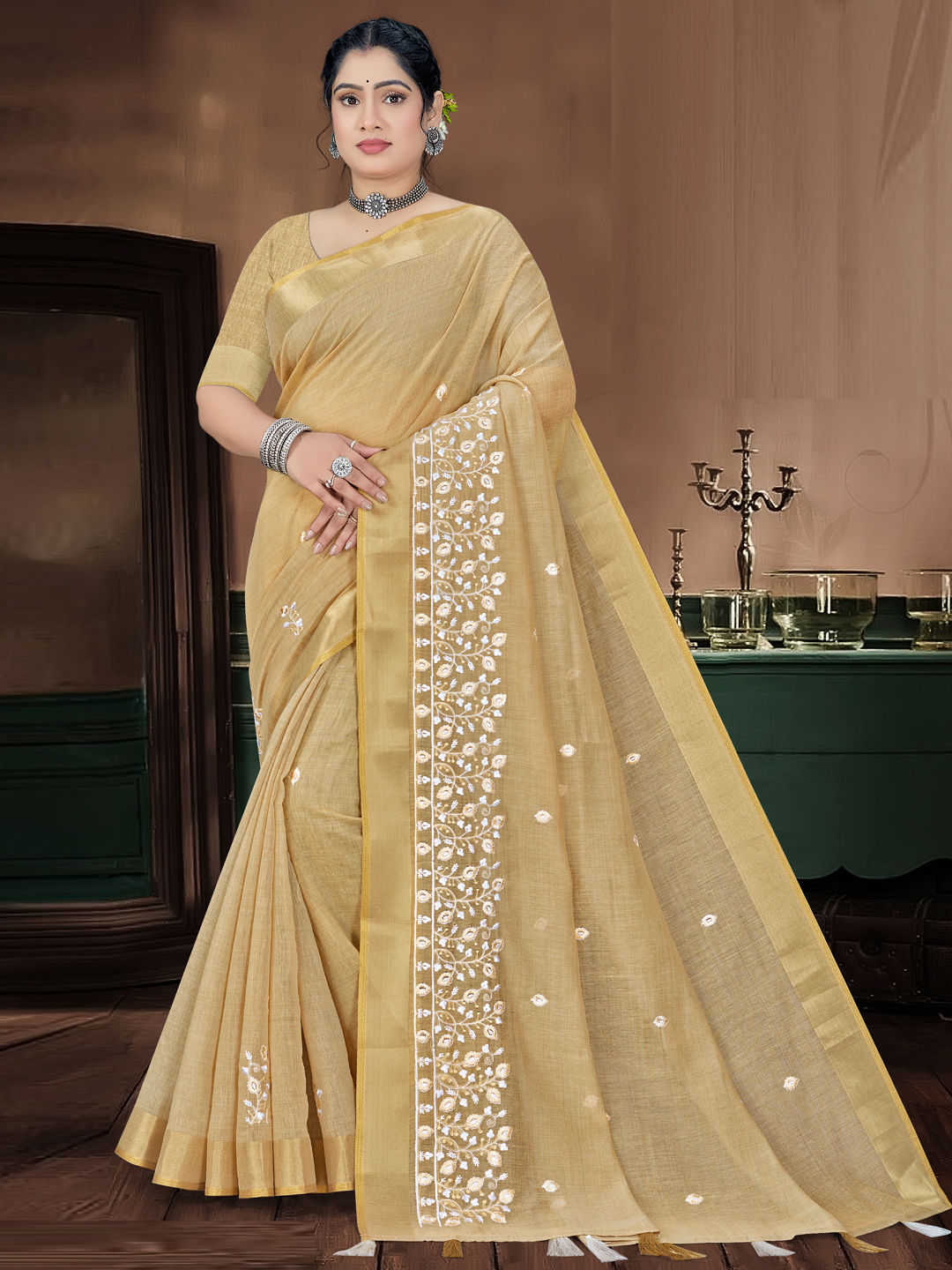 Beige and Brown color Saree in Tussar Silk fabric with Embroidered, Resham work