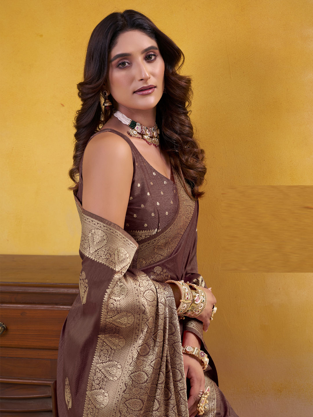 Tussar Silk Party Wear Saree in Beige and Brown with Weaving work