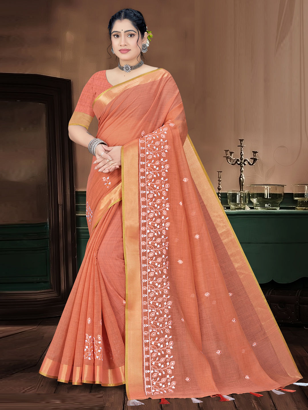 Tussar Silk Party Wear Saree in Orange with Embroidered work