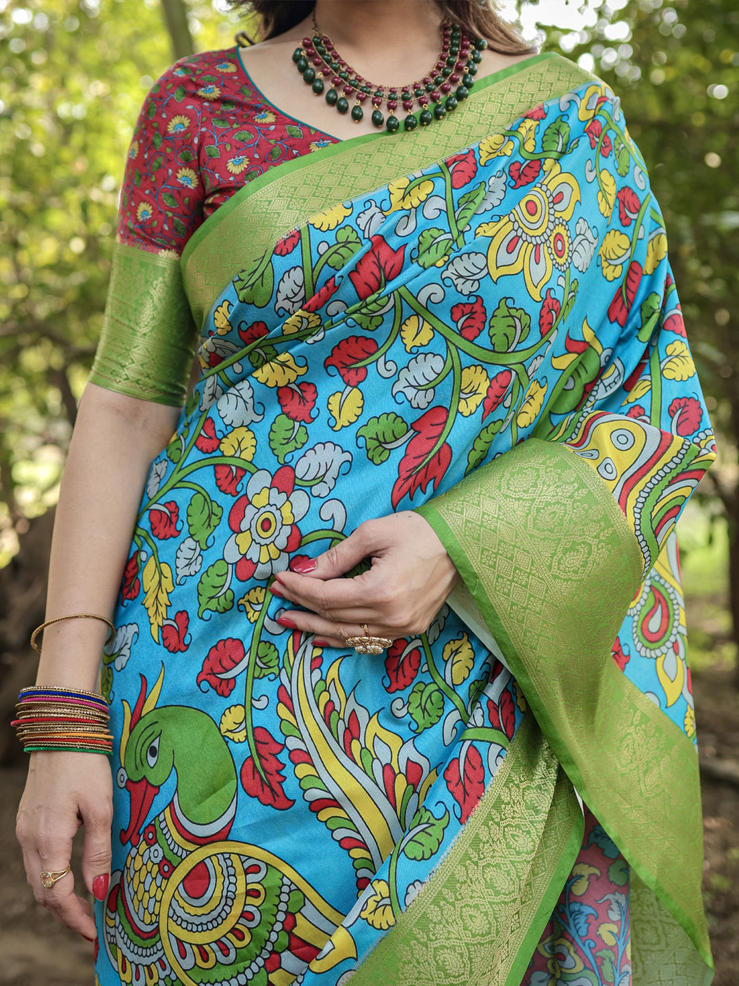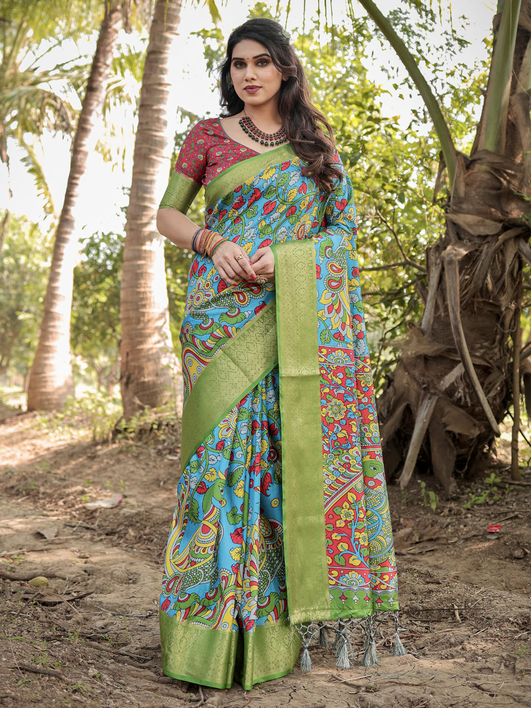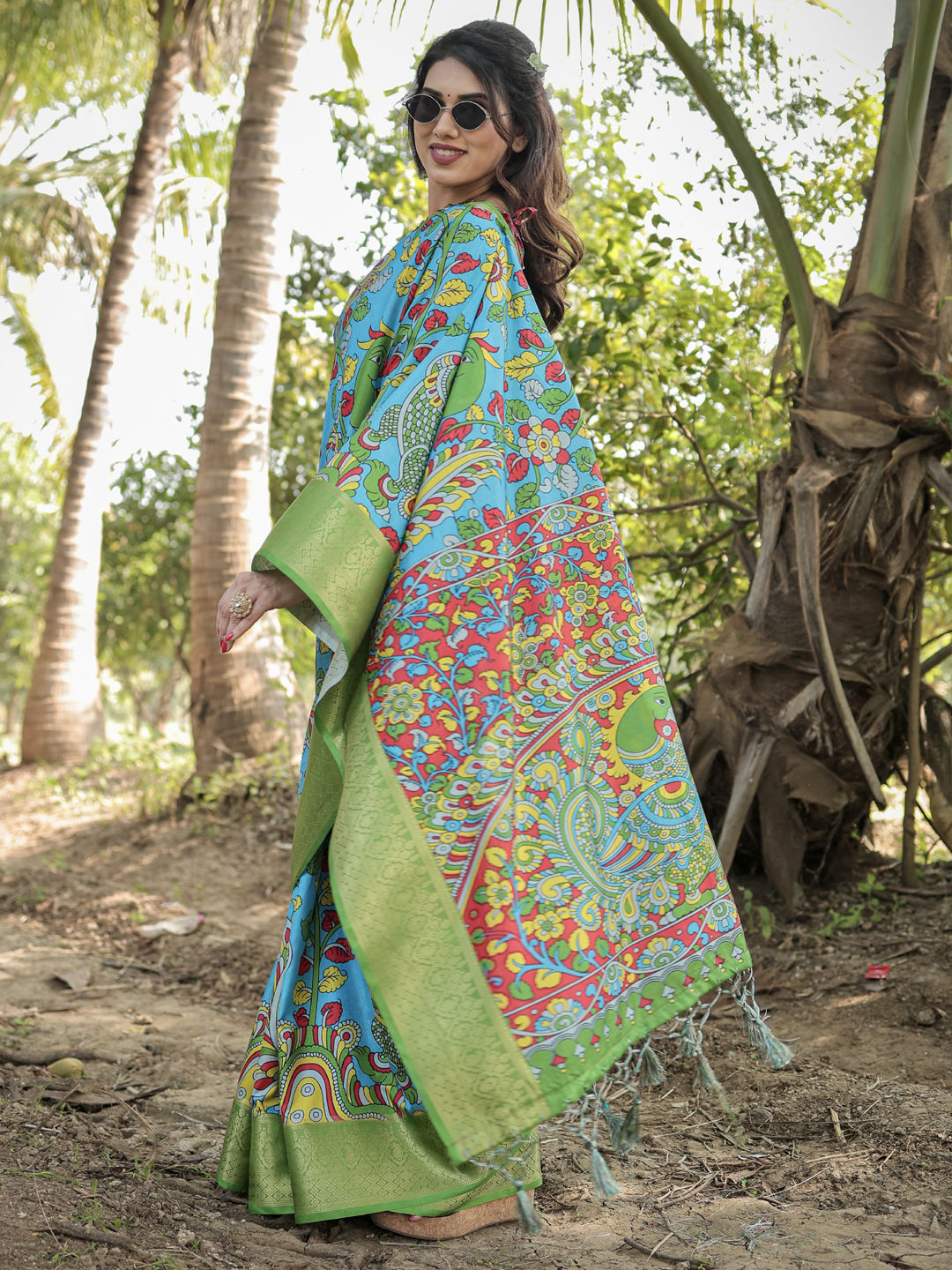Blue, Green color Saree in Tussar Silk fabric with Floral, Printed, Weaving work