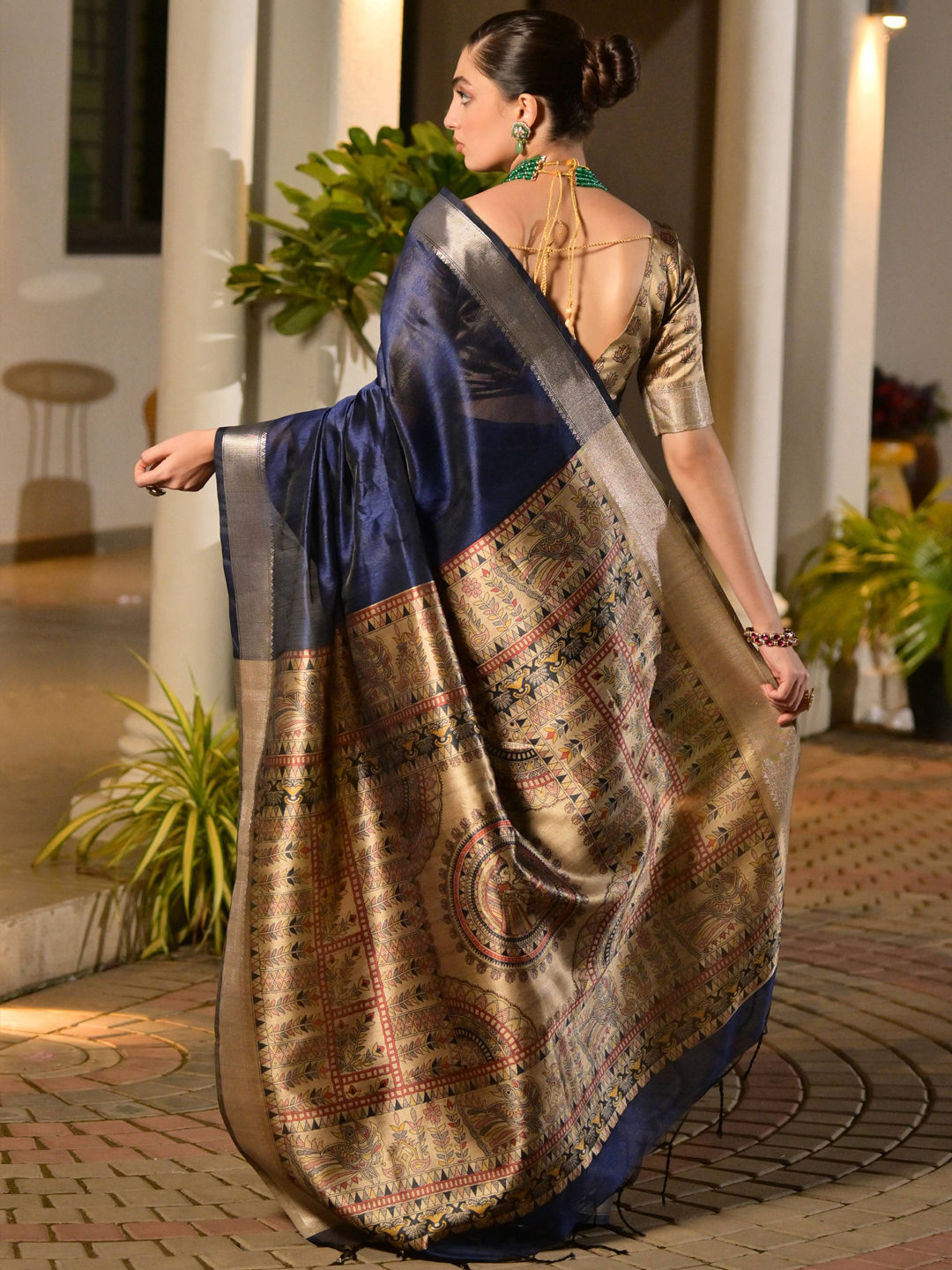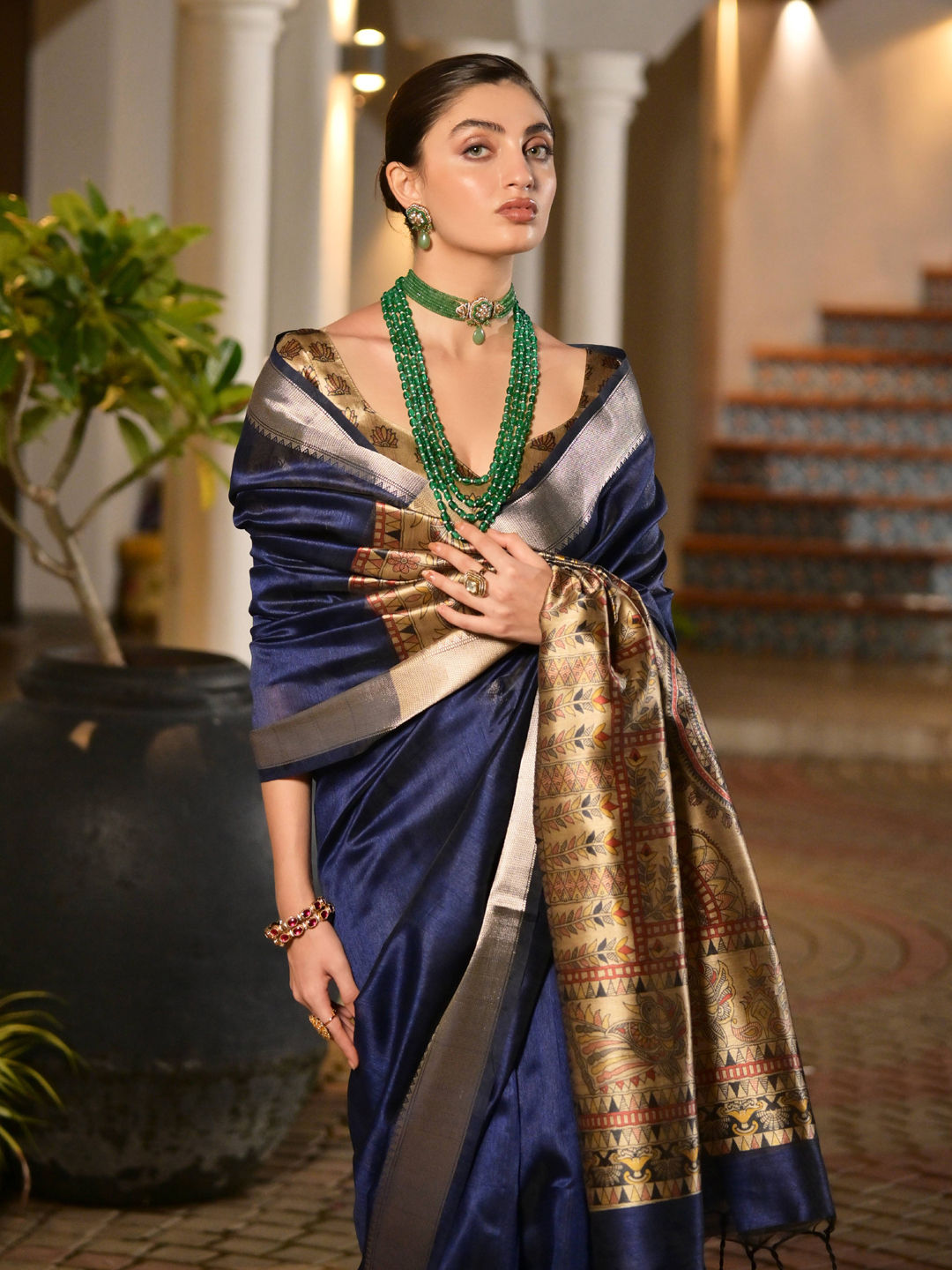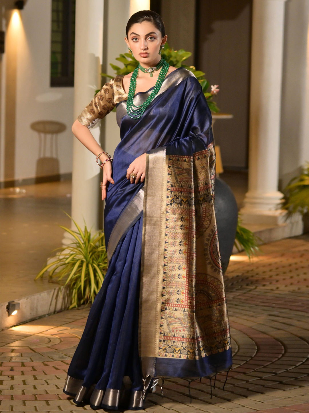 Blue color Saree in Tussar Silk fabric with Border, Zari work