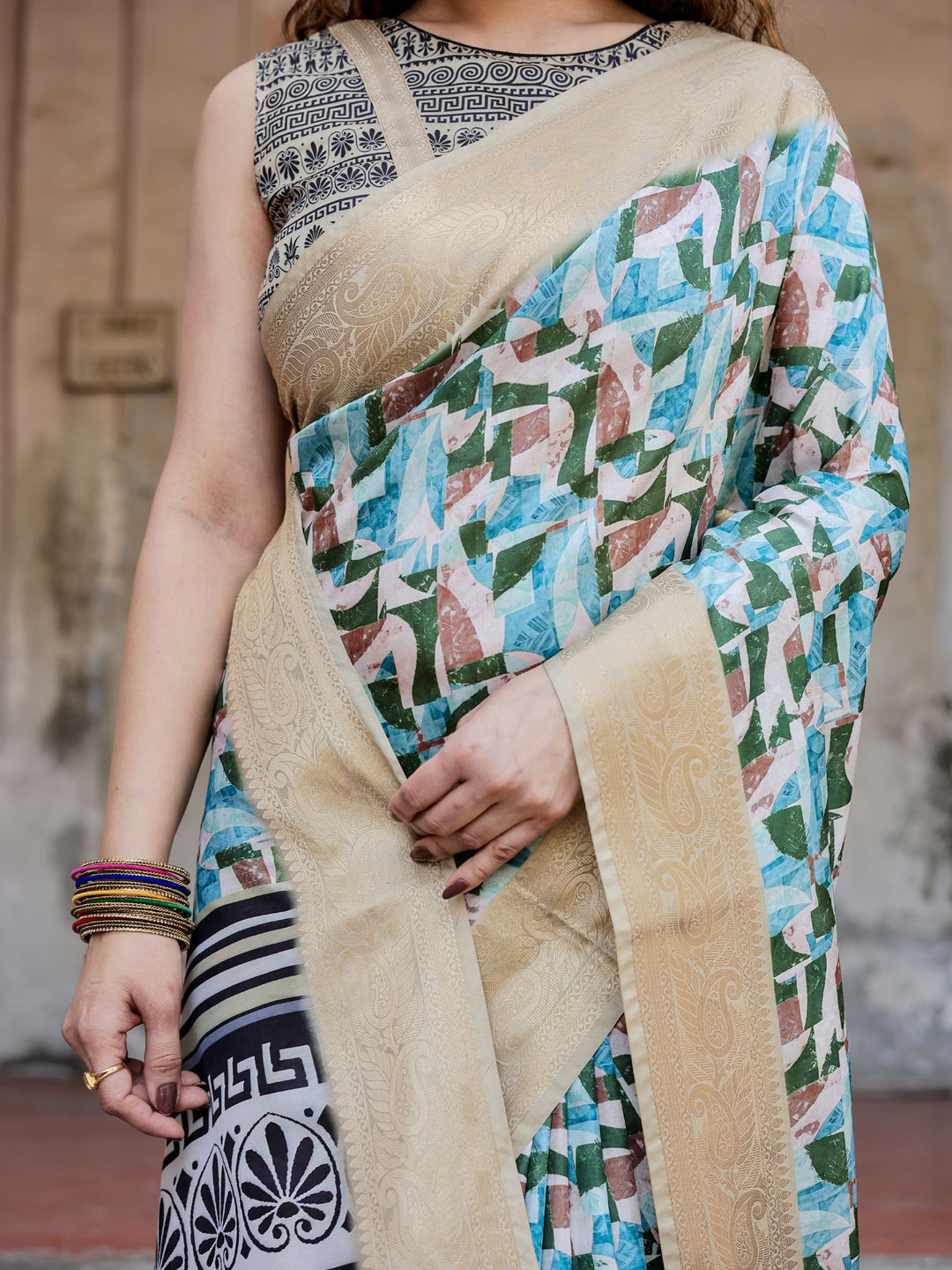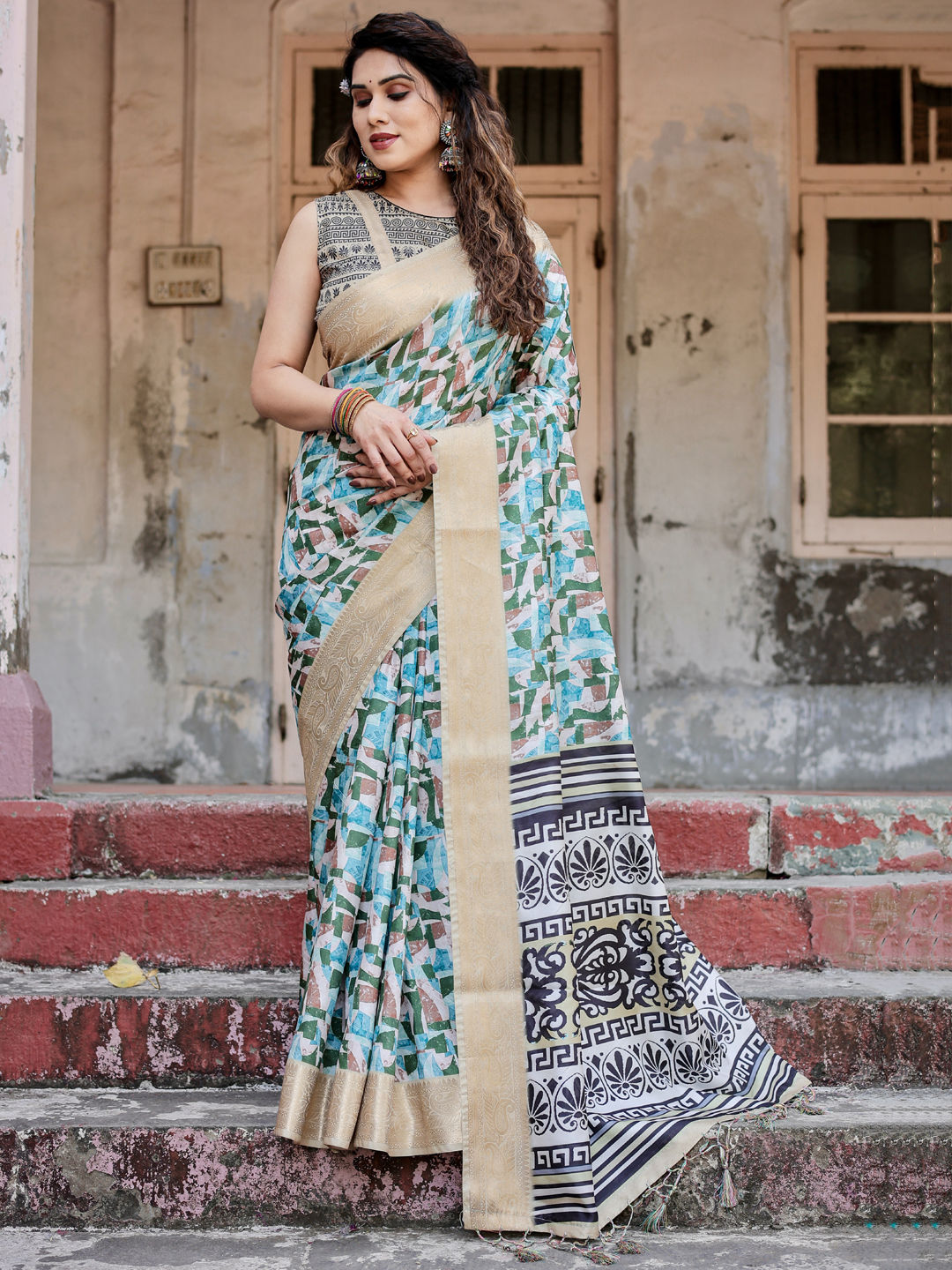 Gold color Saree in Tussar Silk fabric with Floral, Printed, Weaving work