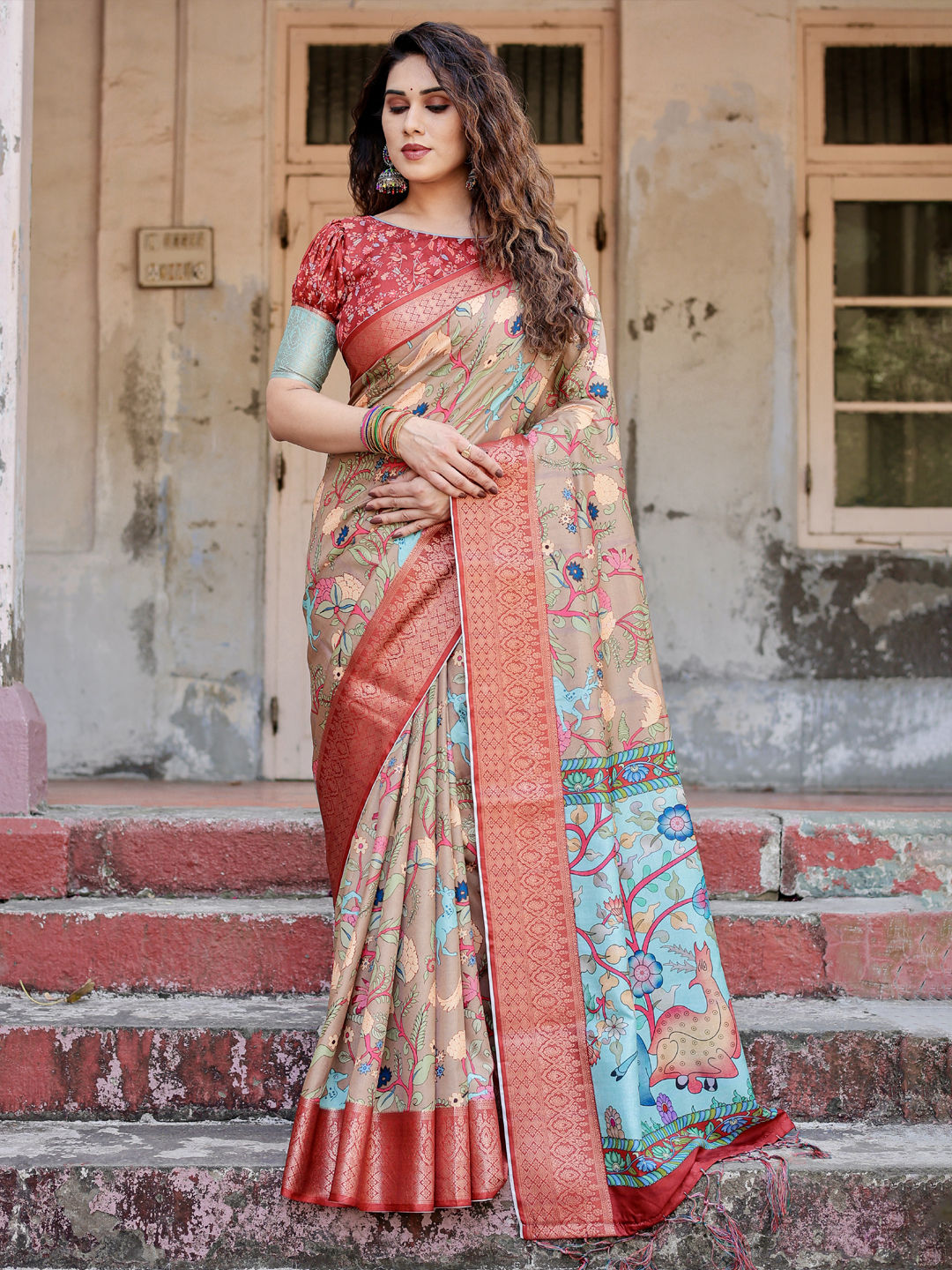 Red and Maroon color Saree in Tussar Silk fabric with Floral, Printed, Weaving work