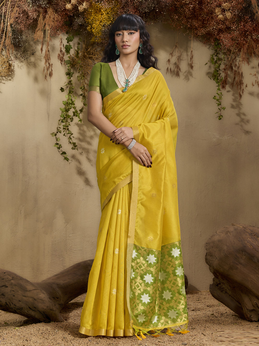 Yellow color Saree in Tussar Silk fabric with Weaving work