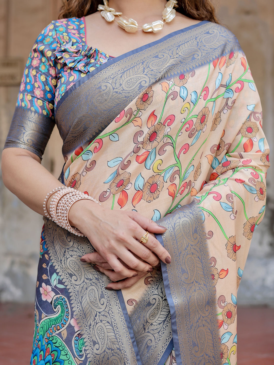Blue color Saree in Tussar Silk fabric with Printed, Weaving work