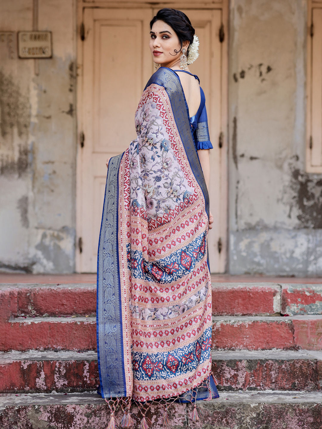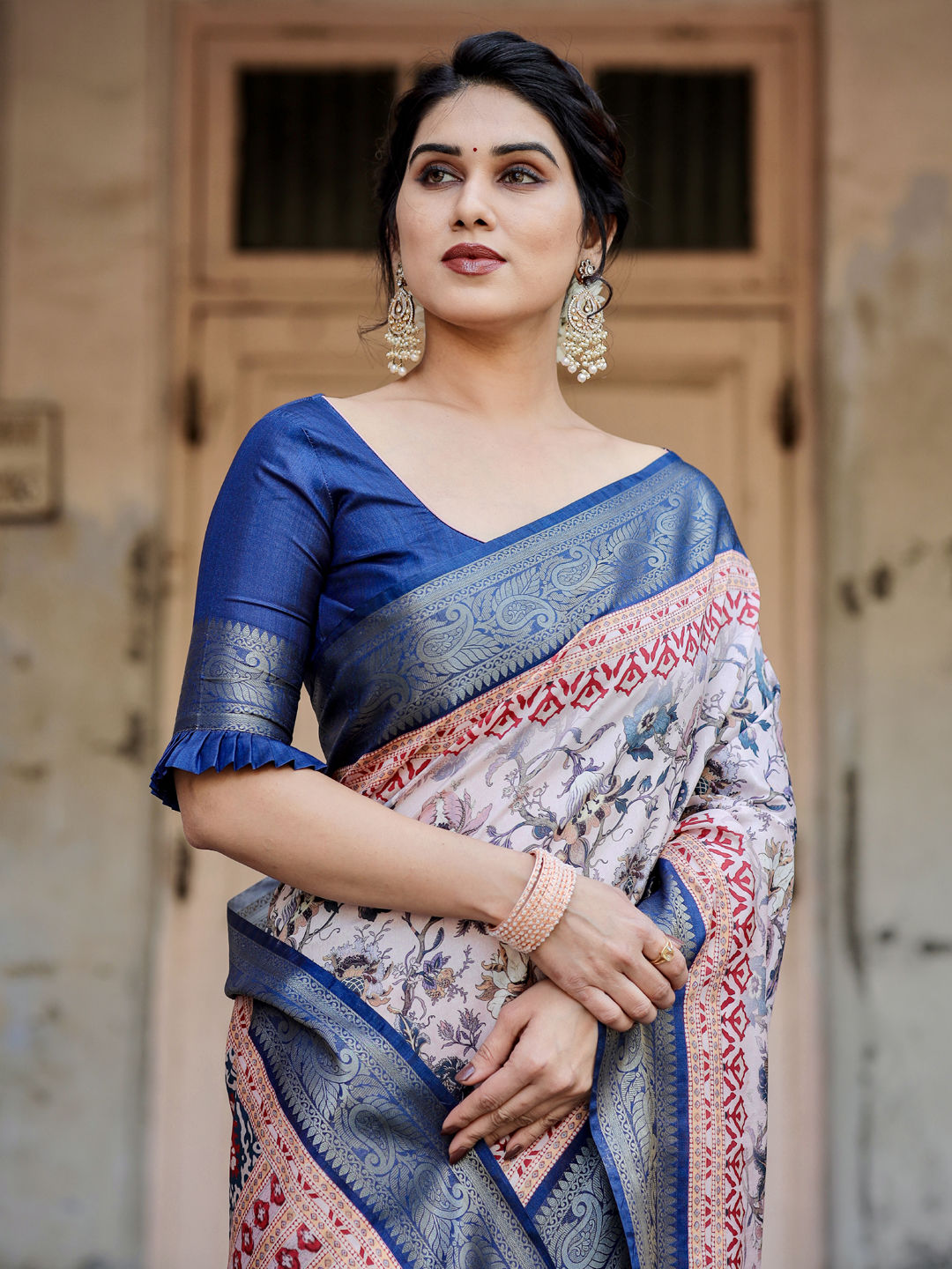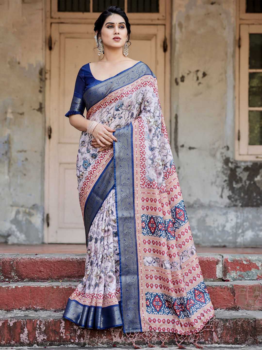 Blue color Saree in Tussar Silk fabric with Floral, Printed, Weaving work