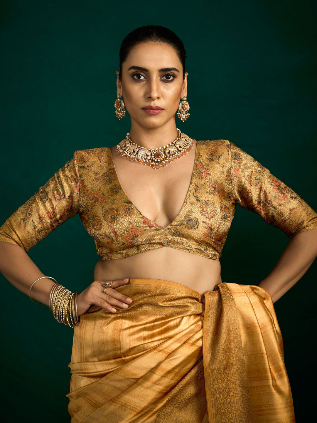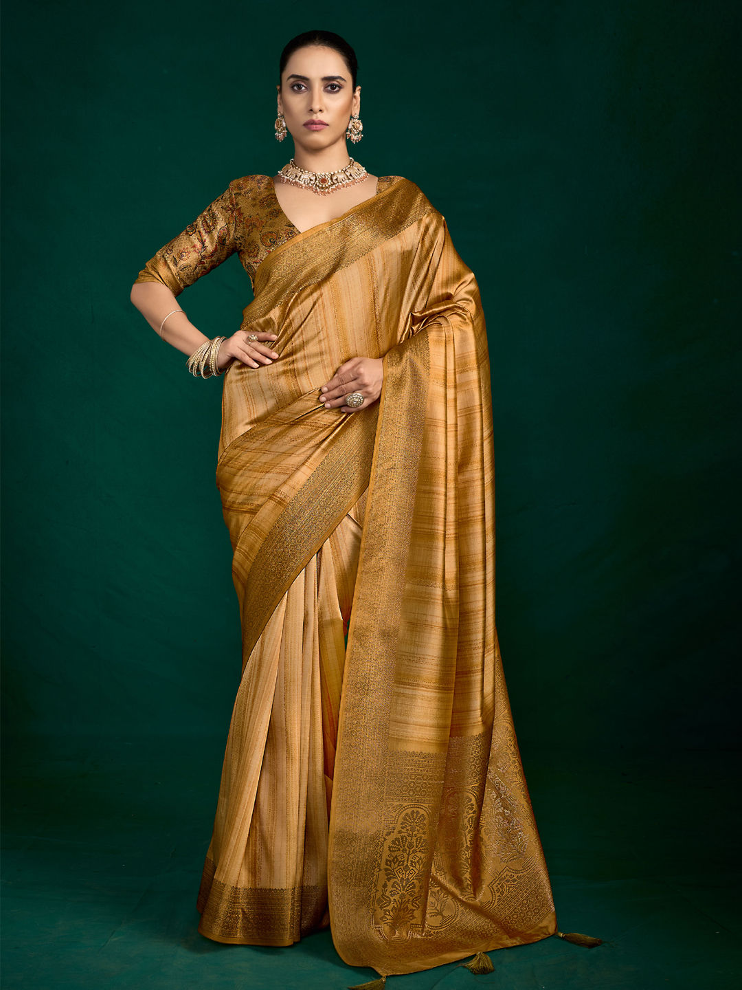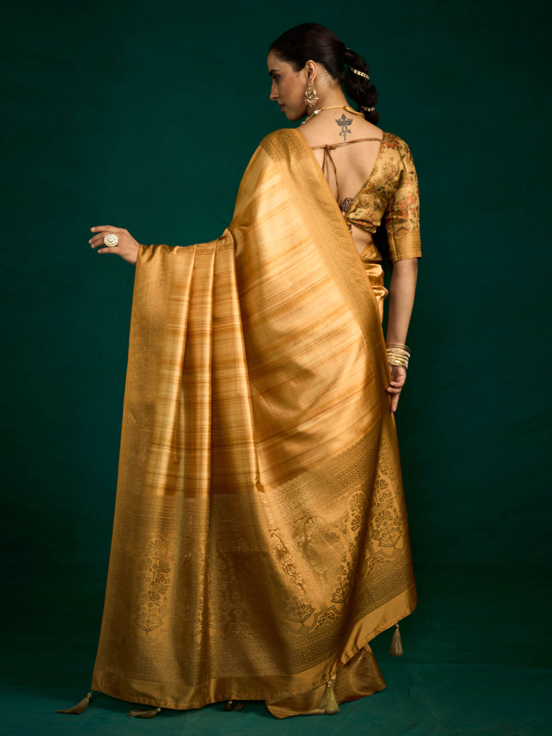 Gold color Saree in Tussar Silk fabric with Digital Print, Weaving work