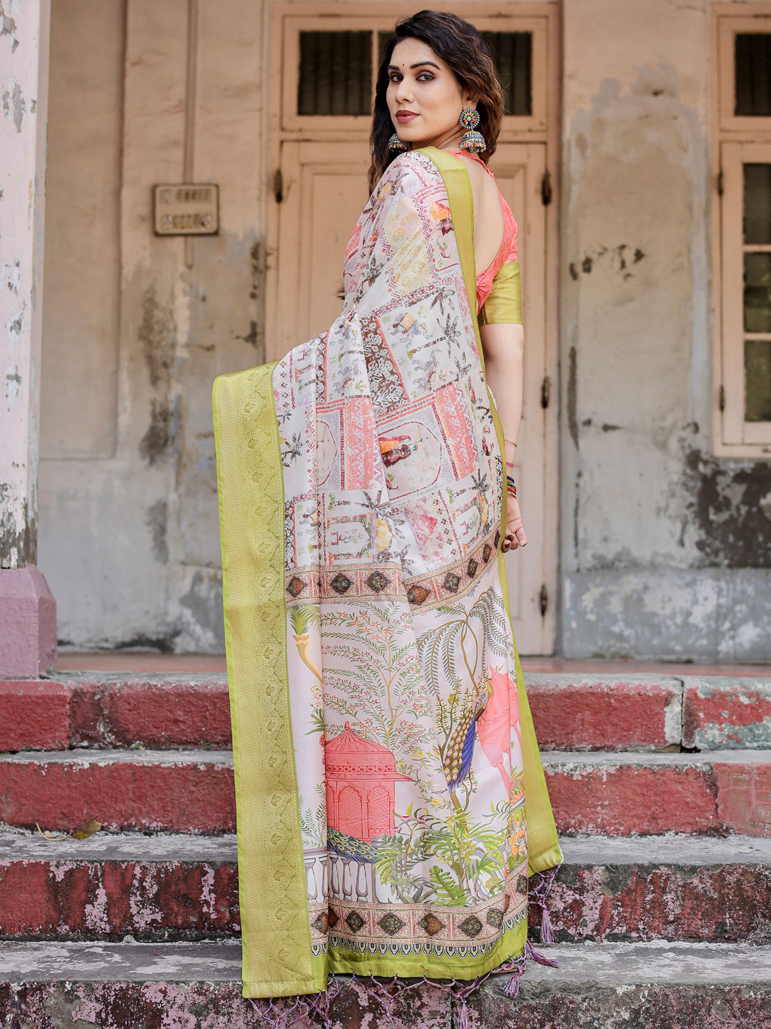 Green color Saree in Tussar Silk fabric with Floral, Printed, Weaving work