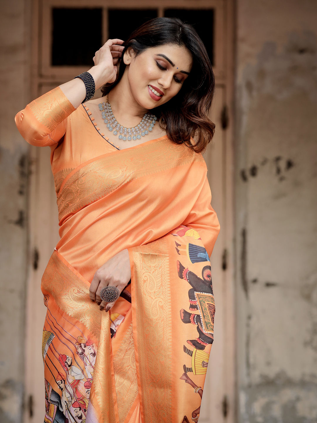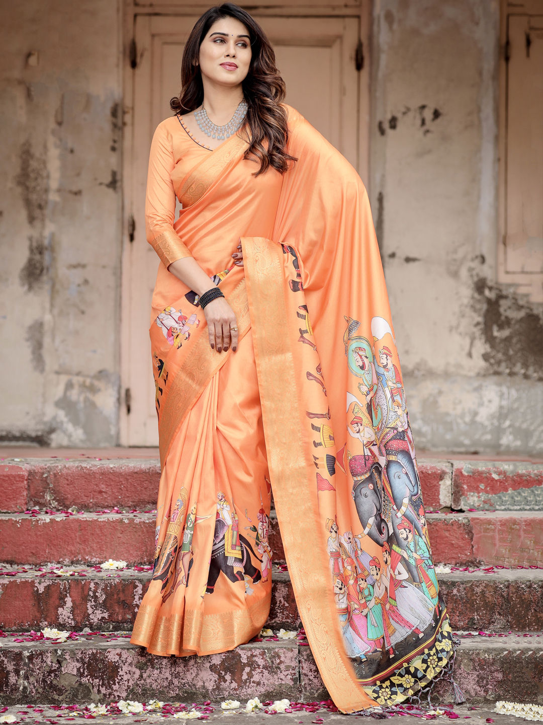 Orange color Saree in Tussar Silk fabric with Printed, Weaving work