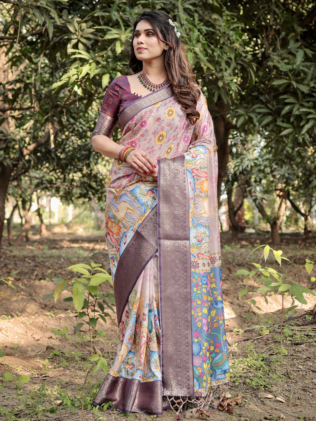 Beige and Brown, Pink and Majenta color Saree in Tussar Silk fabric with Floral, Printed, Weaving work
