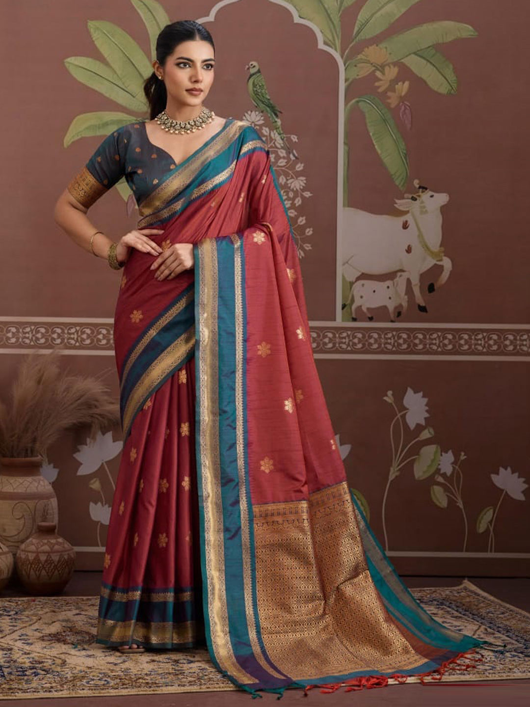 in Red and Maroon with Weaving work