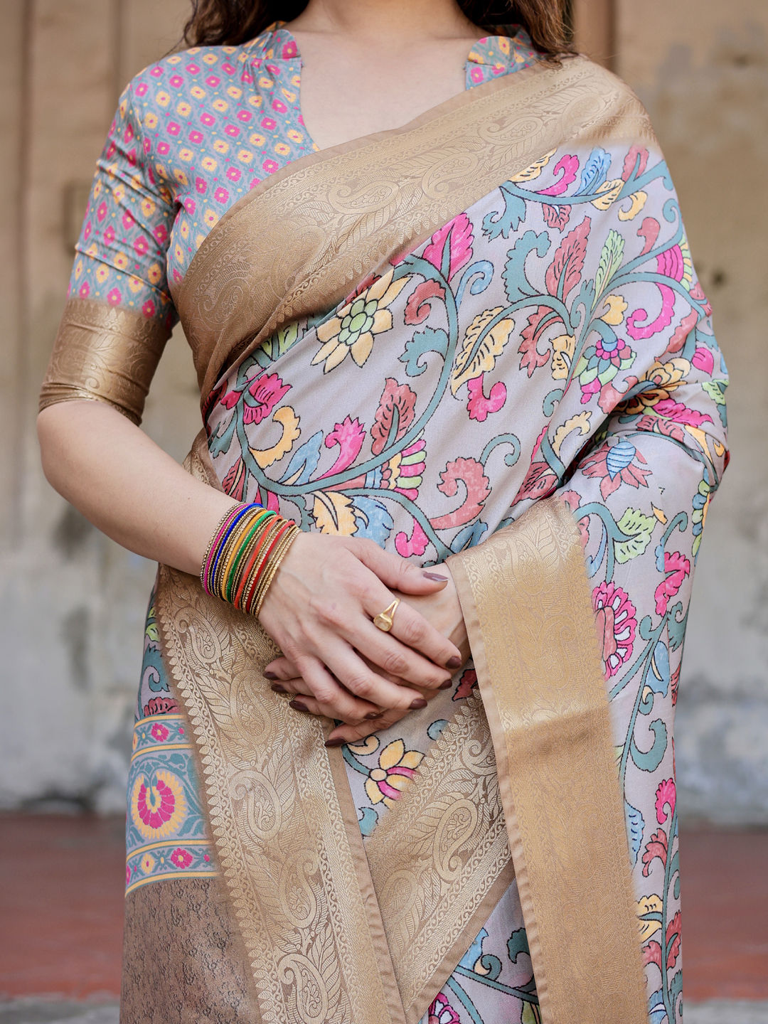 Silver color Saree in Tussar Silk fabric with Floral, Printed, Weaving work
