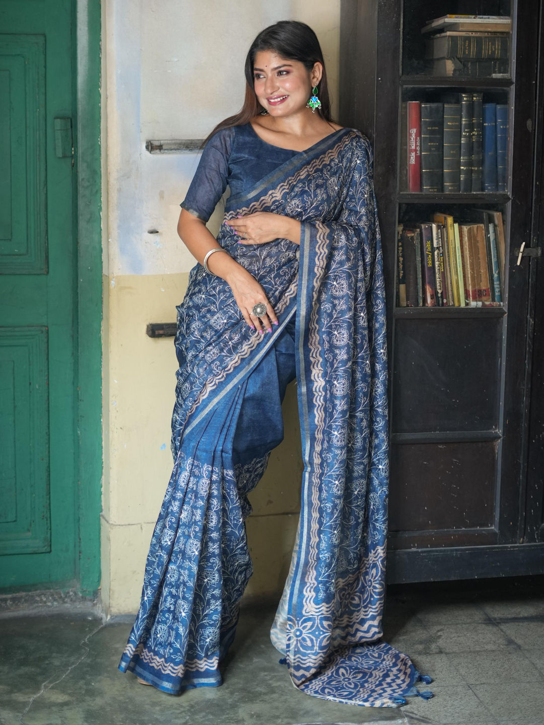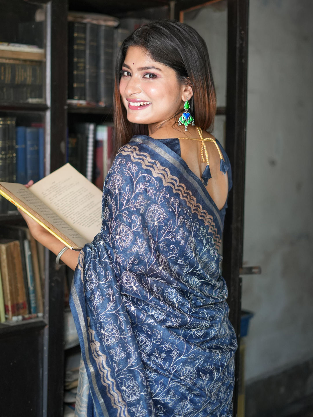 Blue color Saree in Tussar Silk fabric with Embroidered, Printed work