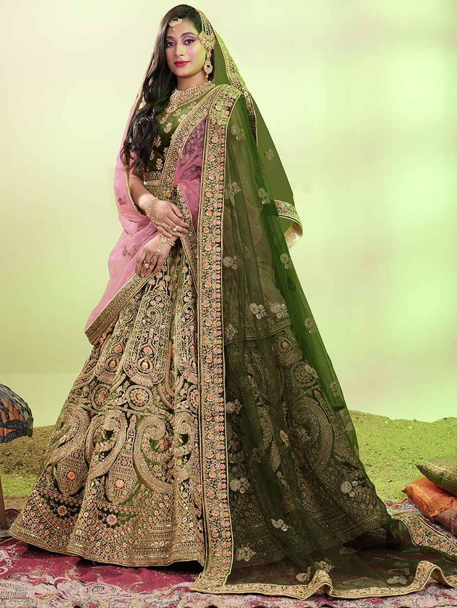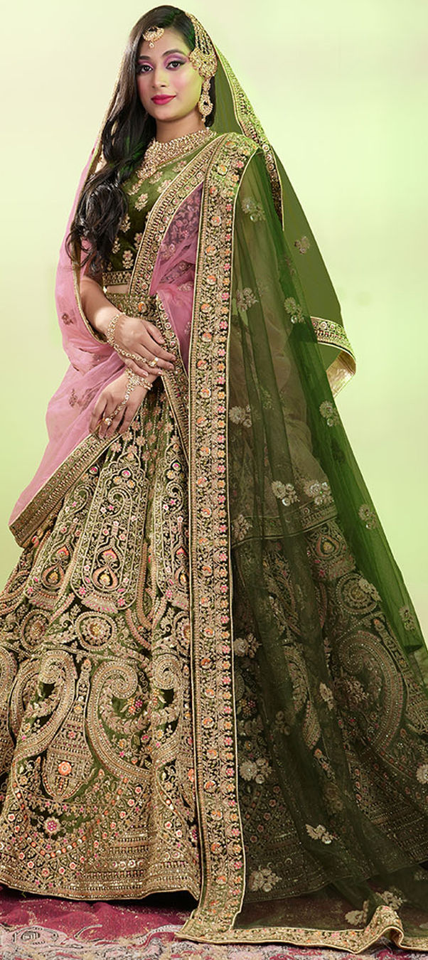 Green color Lehenga in Velvet fabric with Embroidered, Stone, Zardozi work