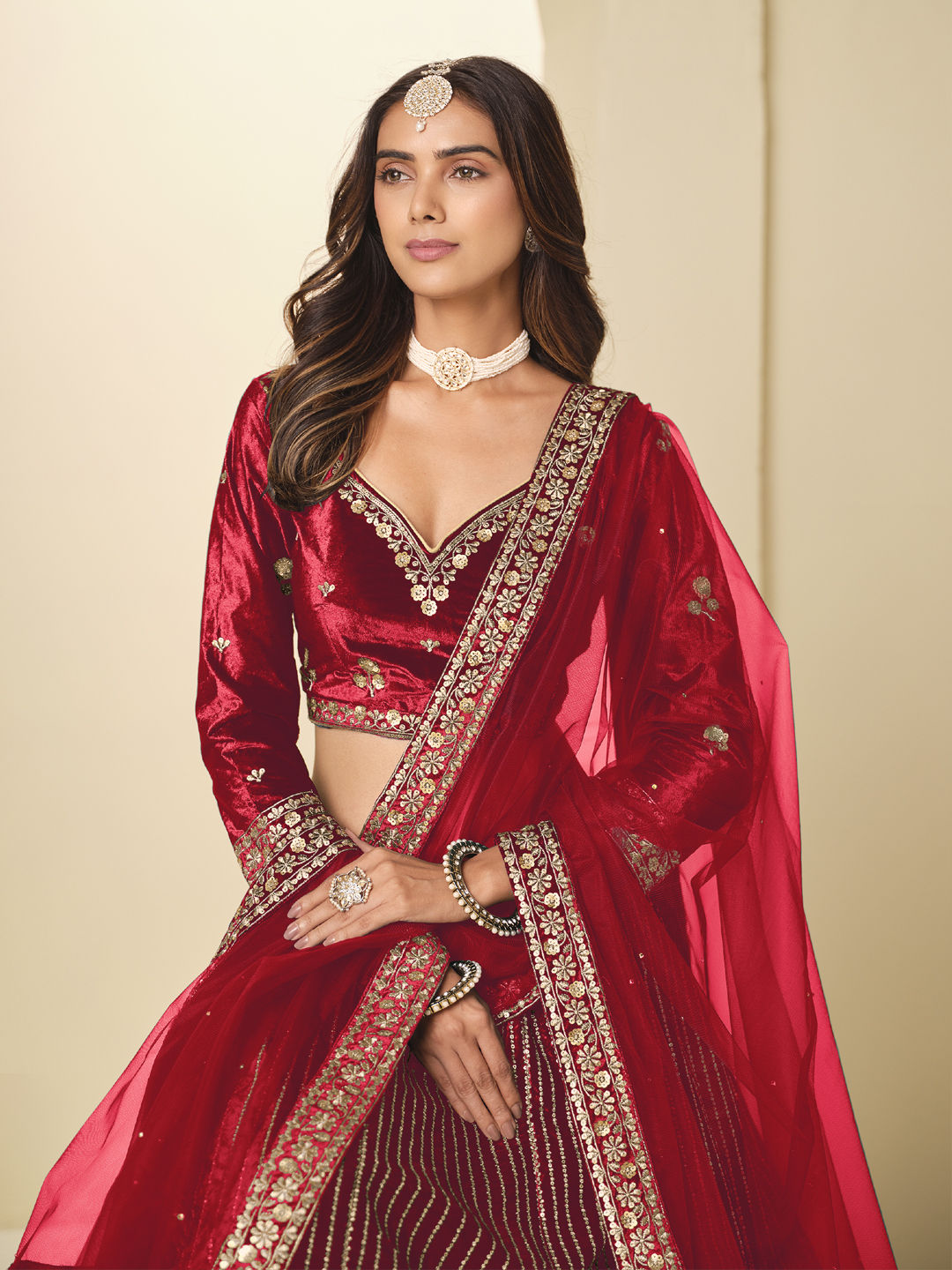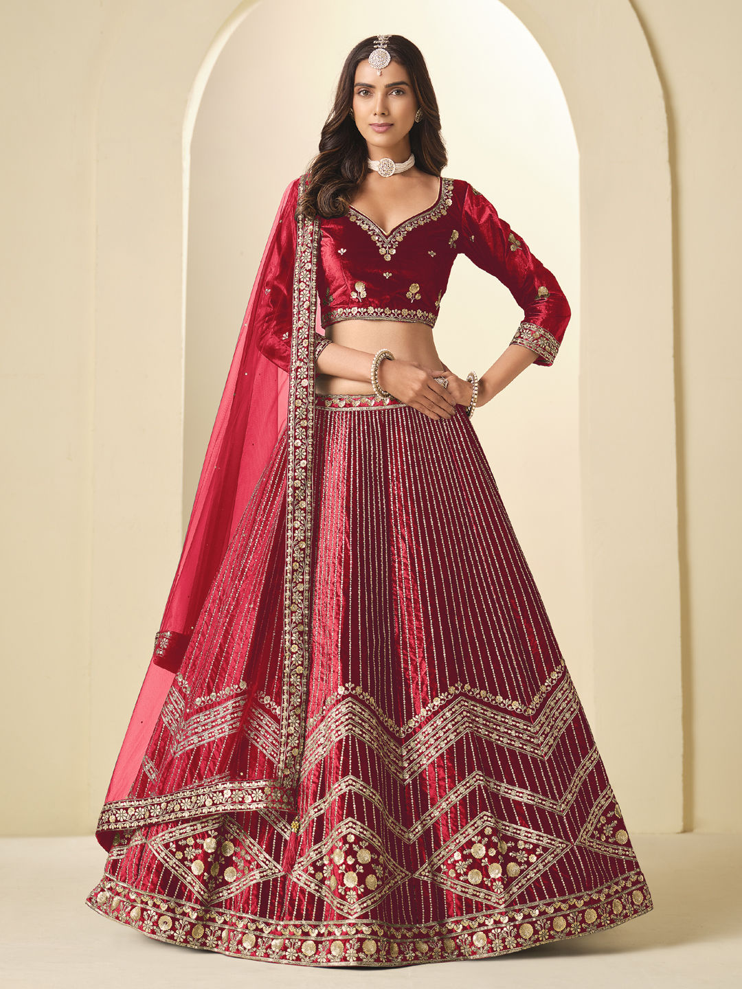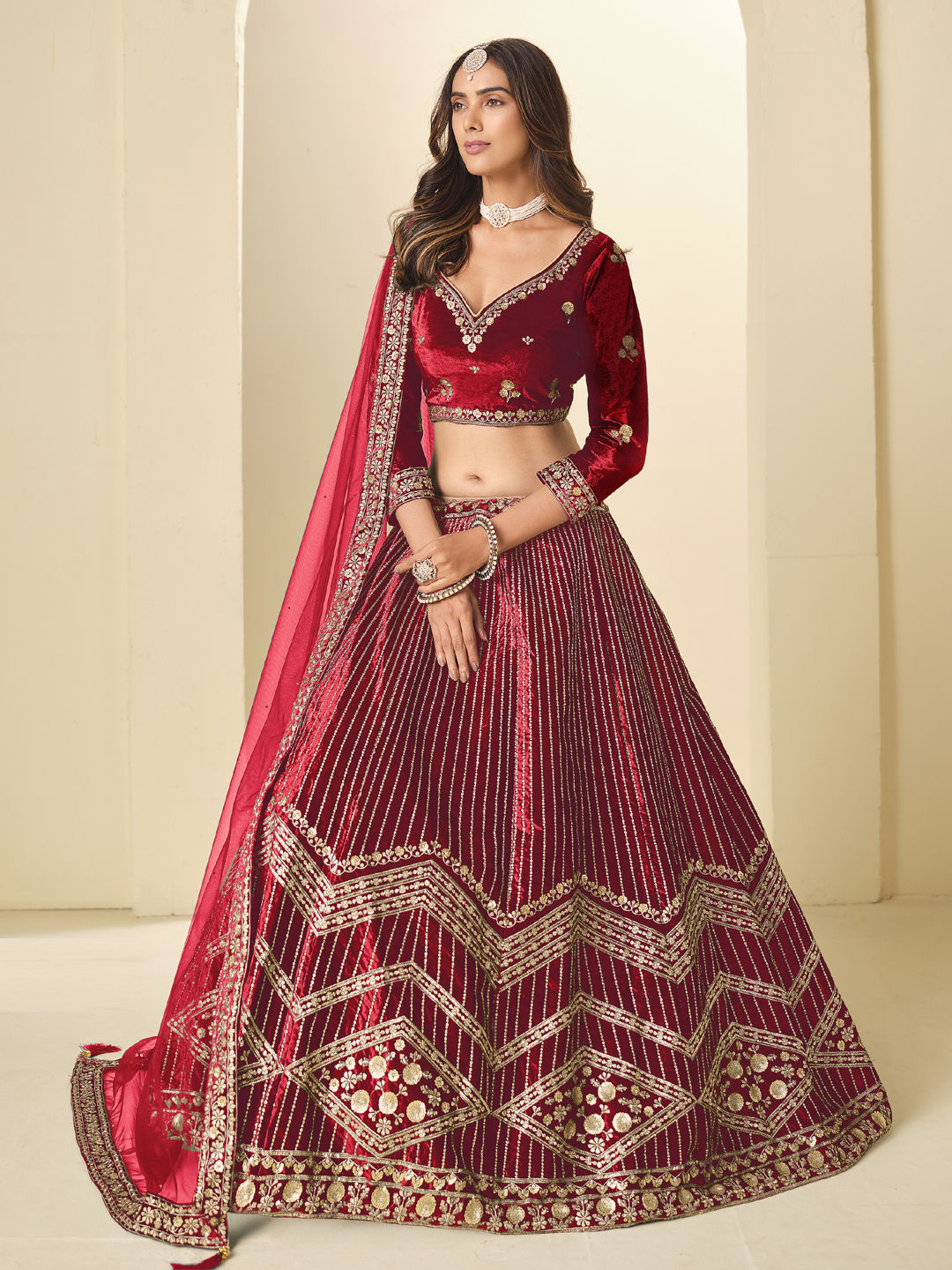 Red and Maroon color Lehenga in Velvet fabric with Sequence work