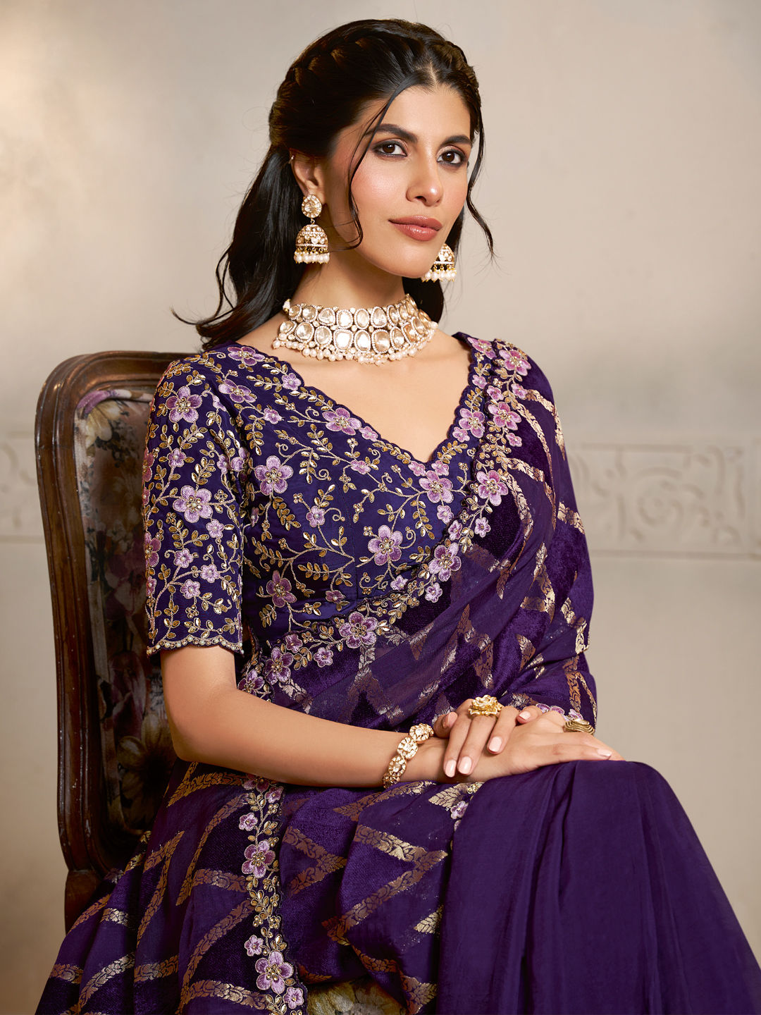Purple and Violet color Saree in Velvet fabric with Embroidered, Stone work