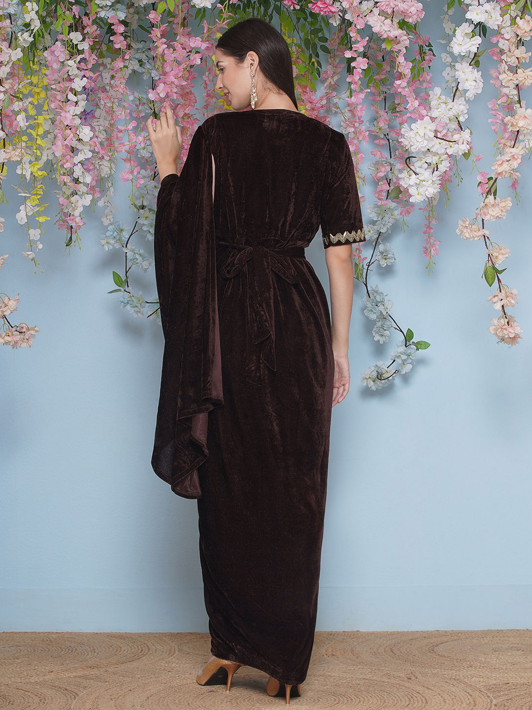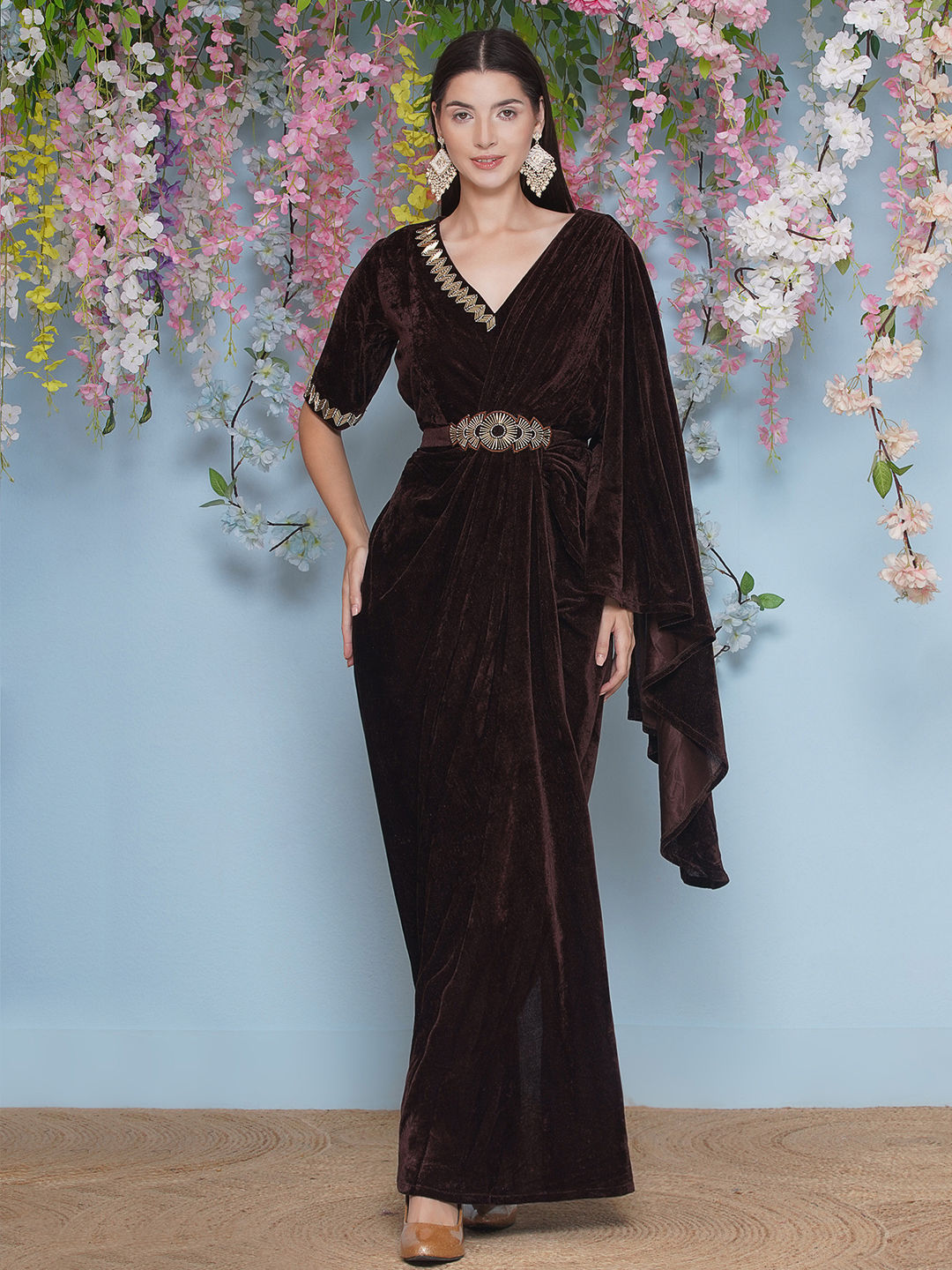 Beige and Brown color Dress in Velvet fabric with Cut Dana work