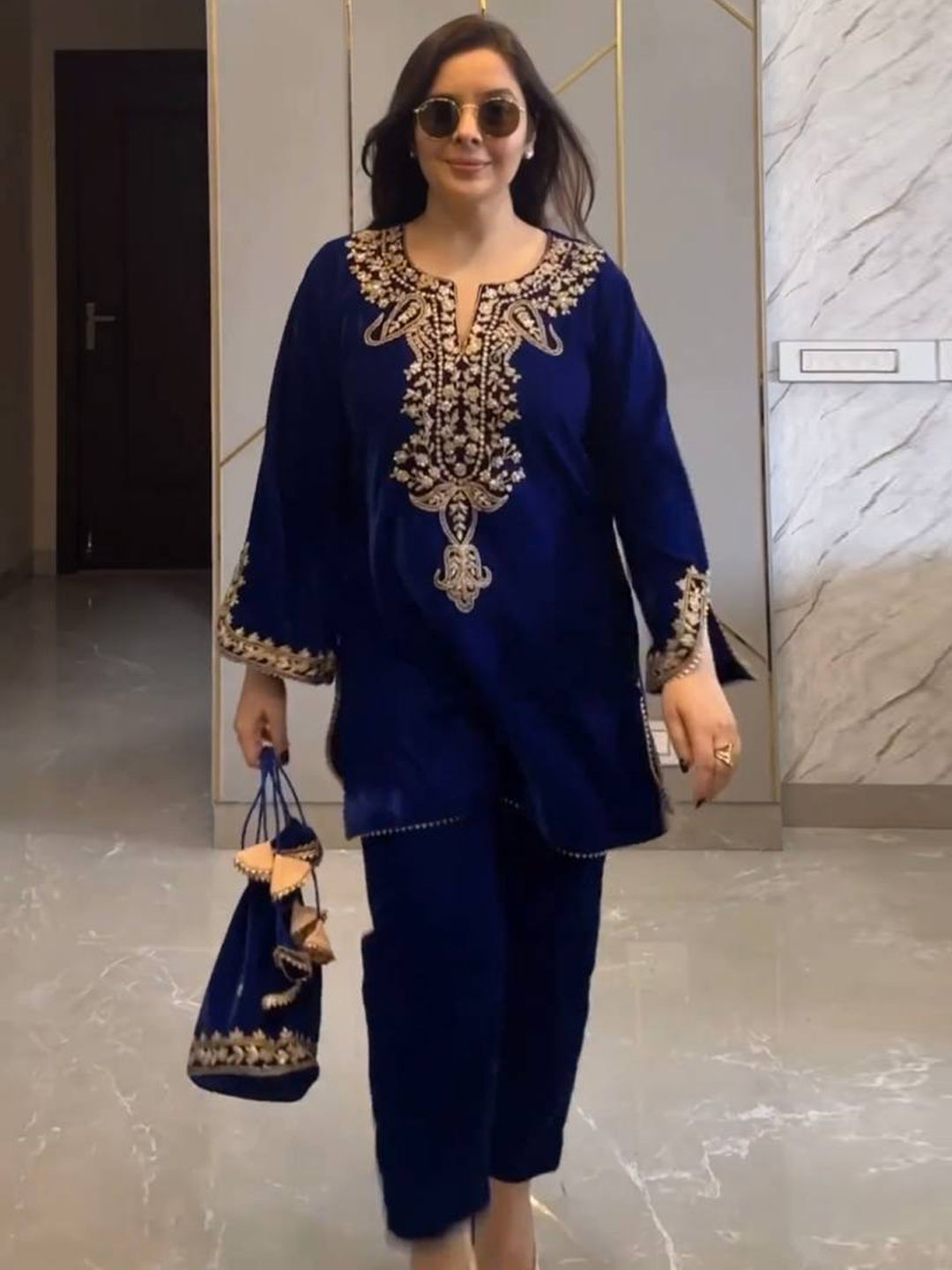 Velvet Festive Salwar Kameez in Blue with Embroidered work