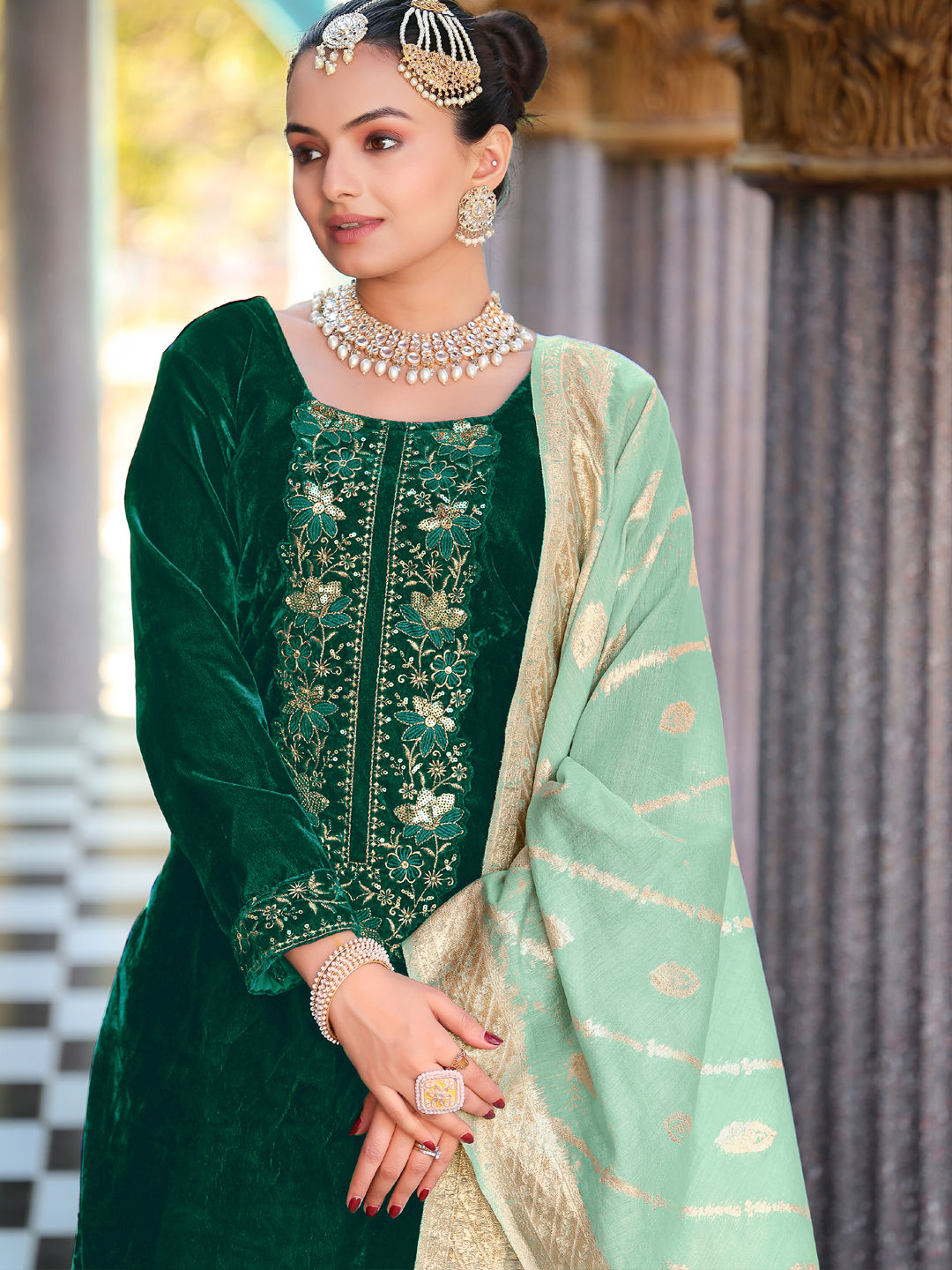 Green color Salwar Kameez in Velvet fabric with Embroidered, Weaving work