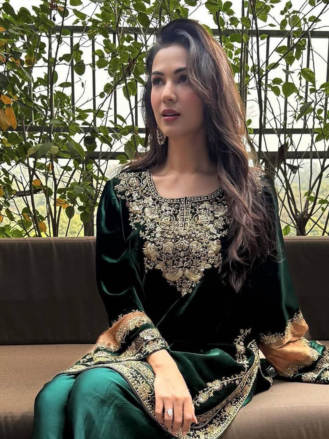 Green color Salwar Kameez in Velvet, Viscose fabric with Embroidered, Sequence, Thread work