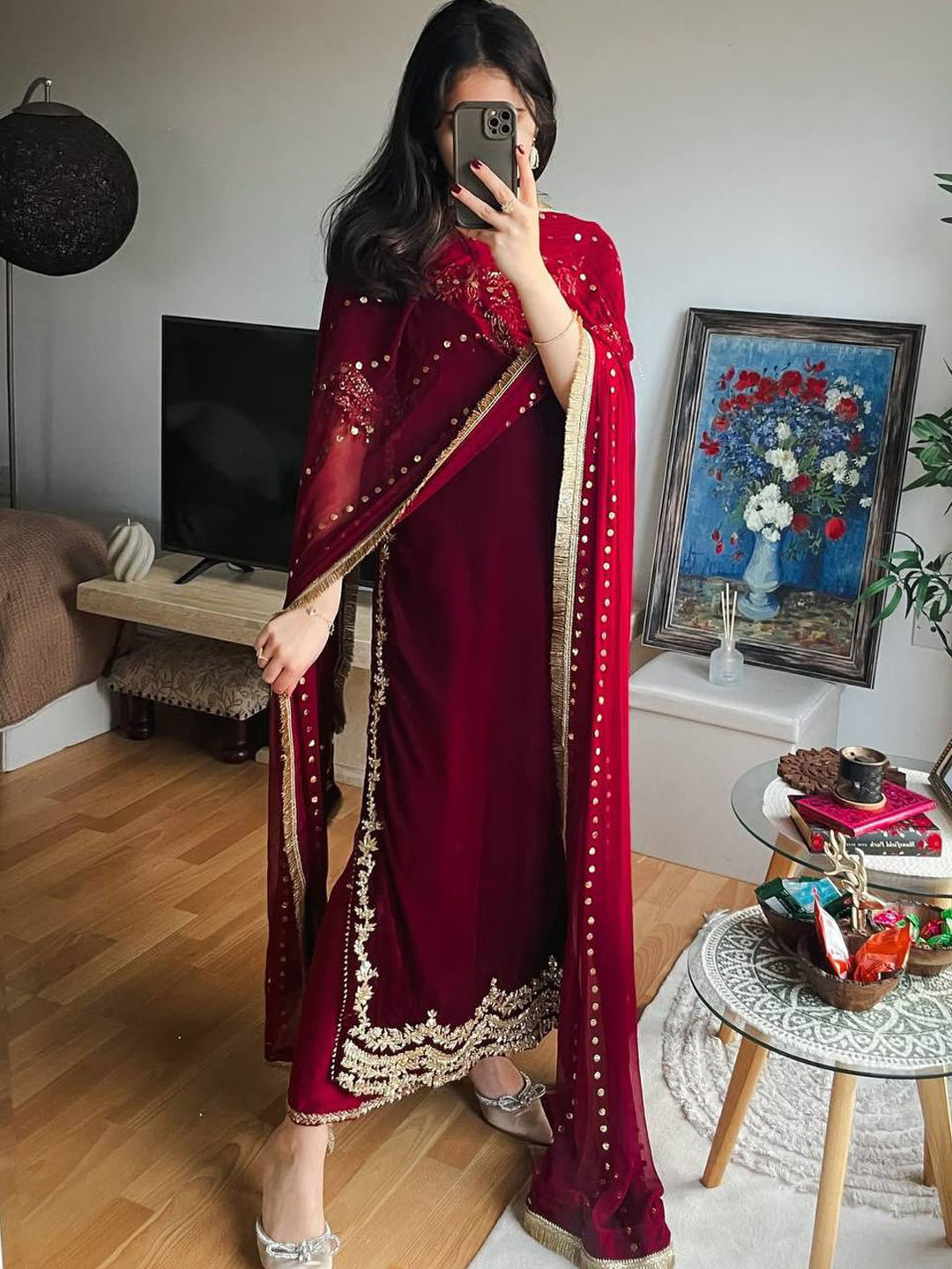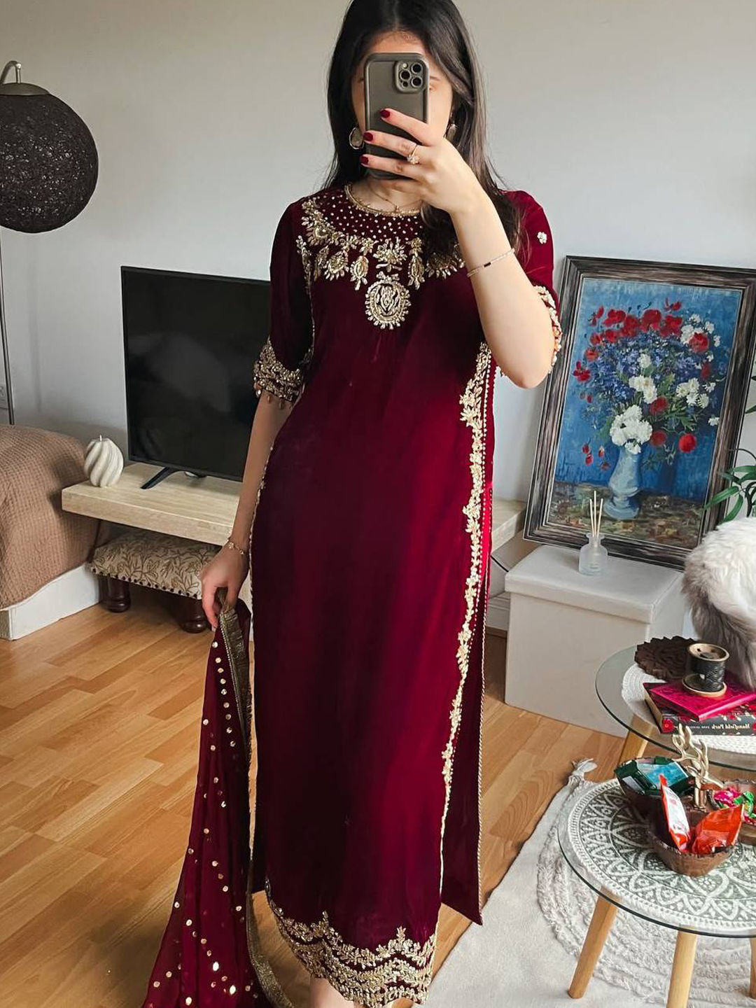 Velvet Reception Salwar Kameez in Red and Maroon with Embroidered work