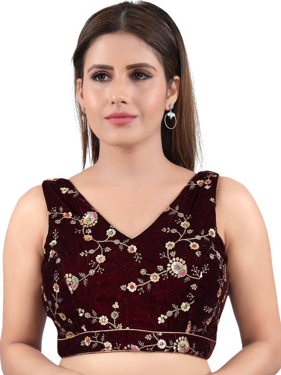 Red and Maroon color Blouse in Velvet fabric with Embroidered, Sequence, Thread, Zari work