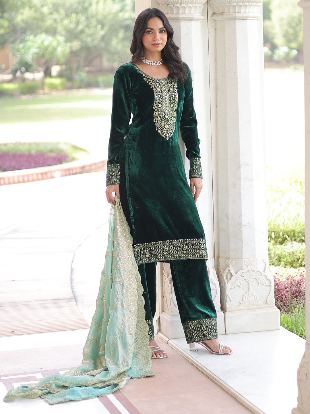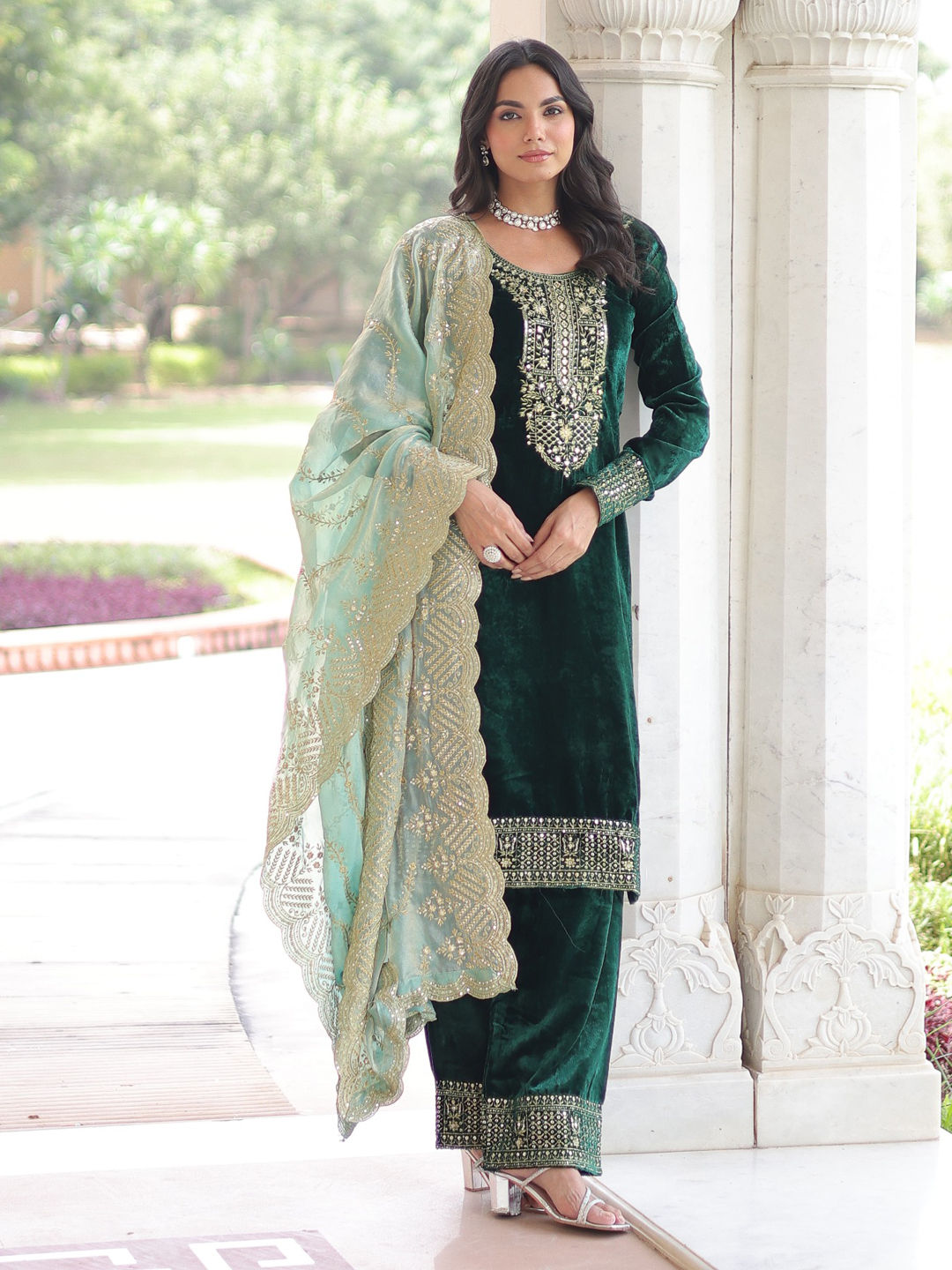 Green color Salwar Kameez in Velvet fabric with Embroidered, Sequence, Zari work