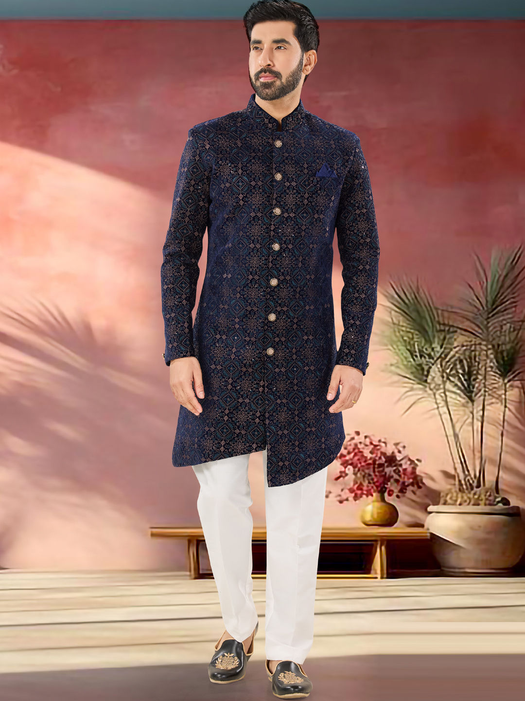 Blue color IndoWestern Dress in Velvet fabric with Embroidered, Sequence, Thread work