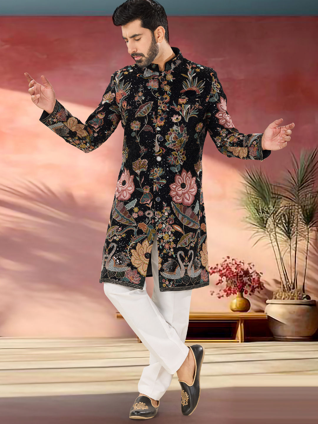 Velvet Wedding IndoWestern Dress in Black and Grey with Thread work