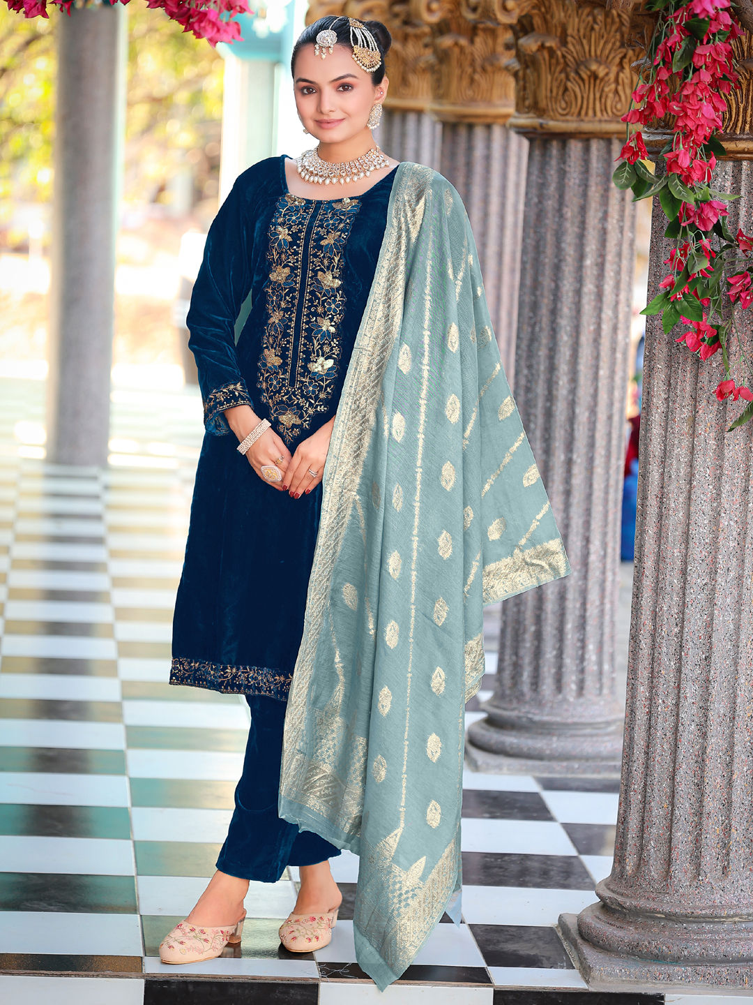 Blue color Salwar Kameez in Velvet fabric with Embroidered, Weaving work