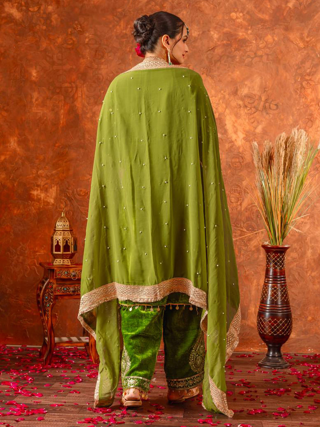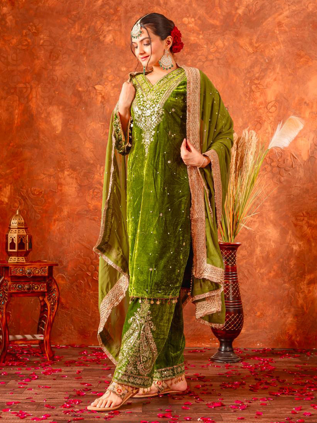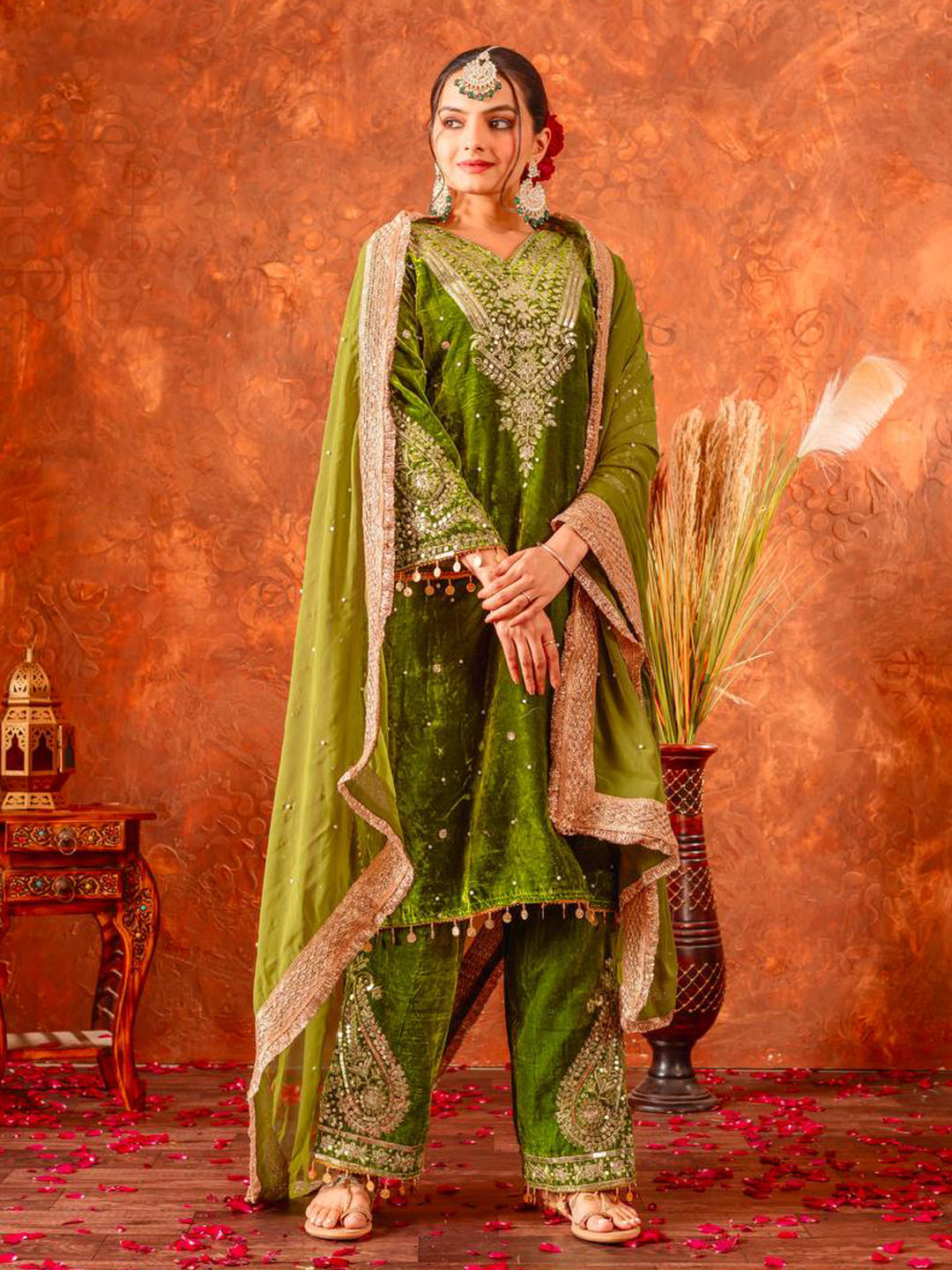 Green color Salwar Kameez in Velvet fabric with Embroidered, Sequence work