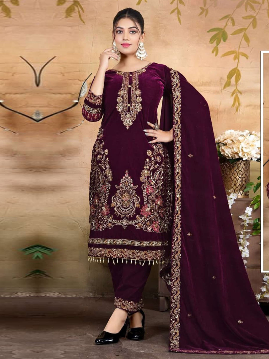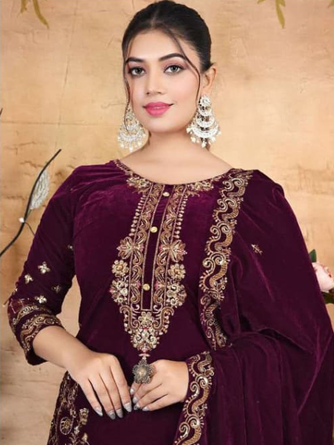 Pink and Majenta color Salwar Kameez in Velvet fabric with Embroidered, Sequence, Zircon work