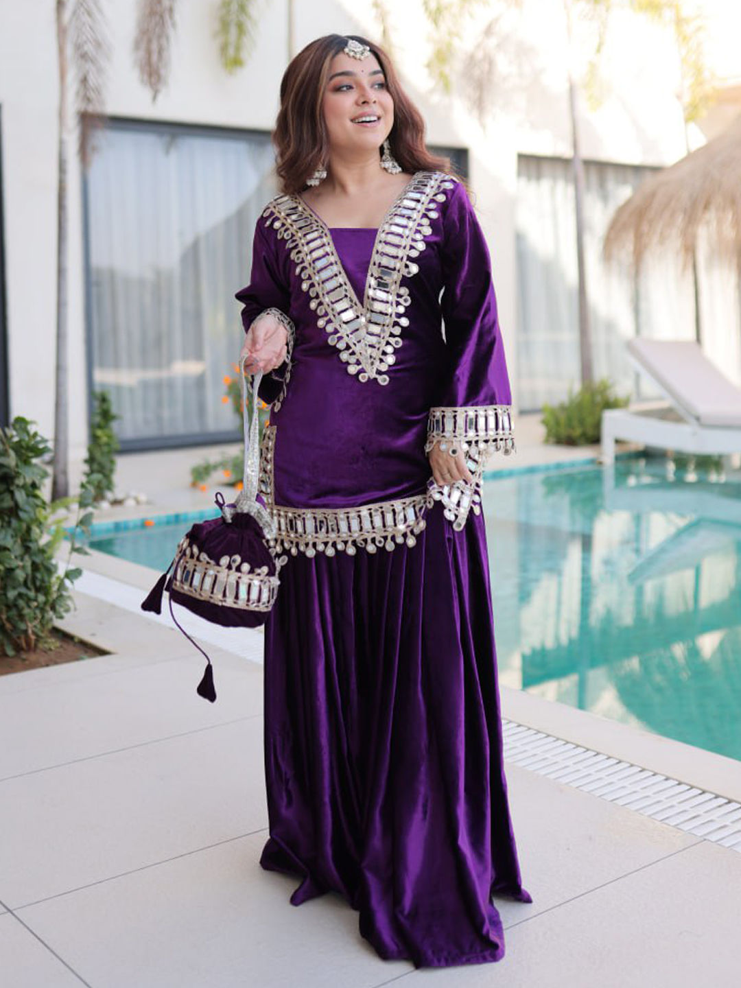 Purple and Violet color Salwar Kameez in Velvet fabric with Mirror work