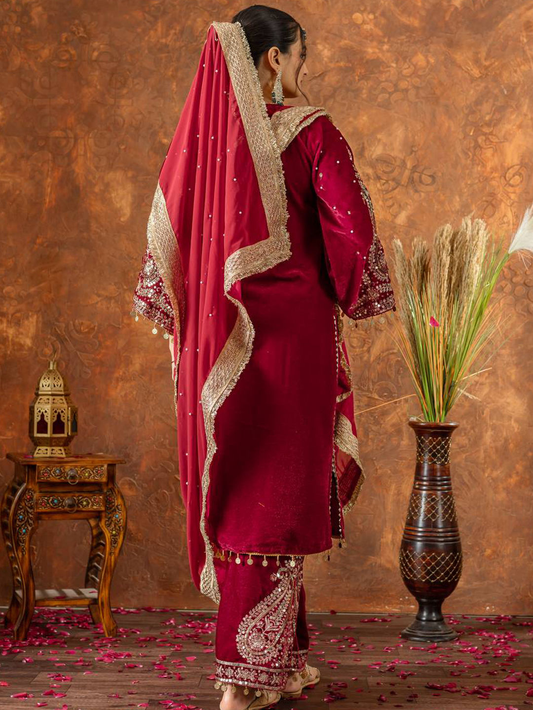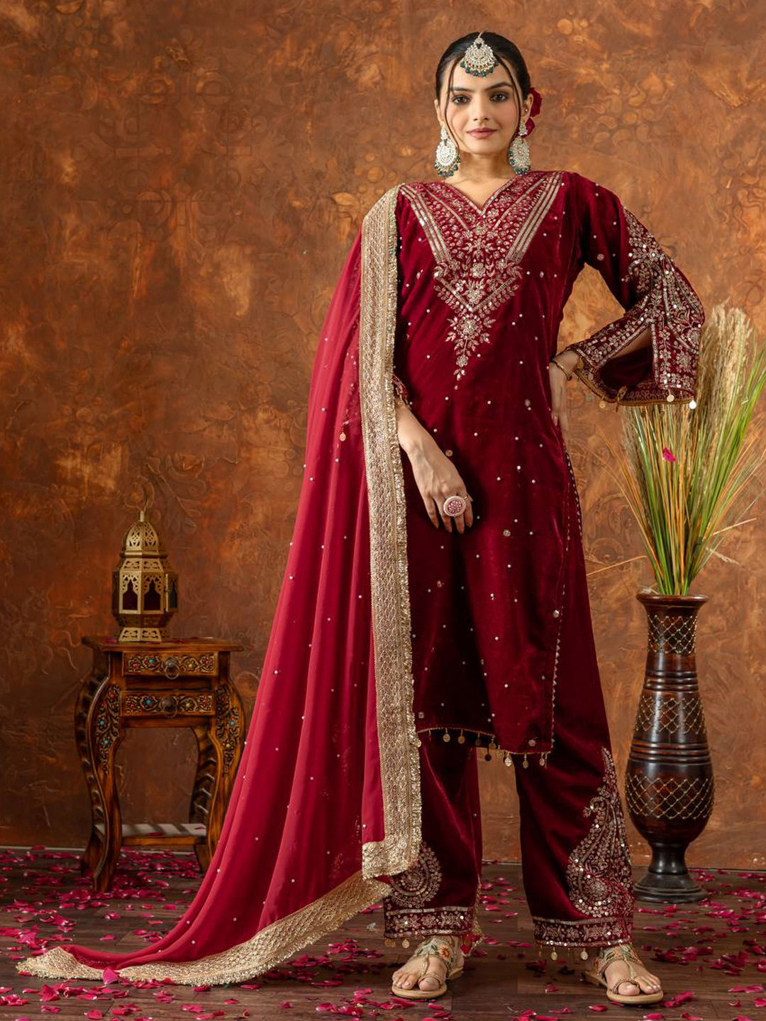 Red and Maroon color Salwar Kameez in Velvet fabric with Embroidered, Sequence work