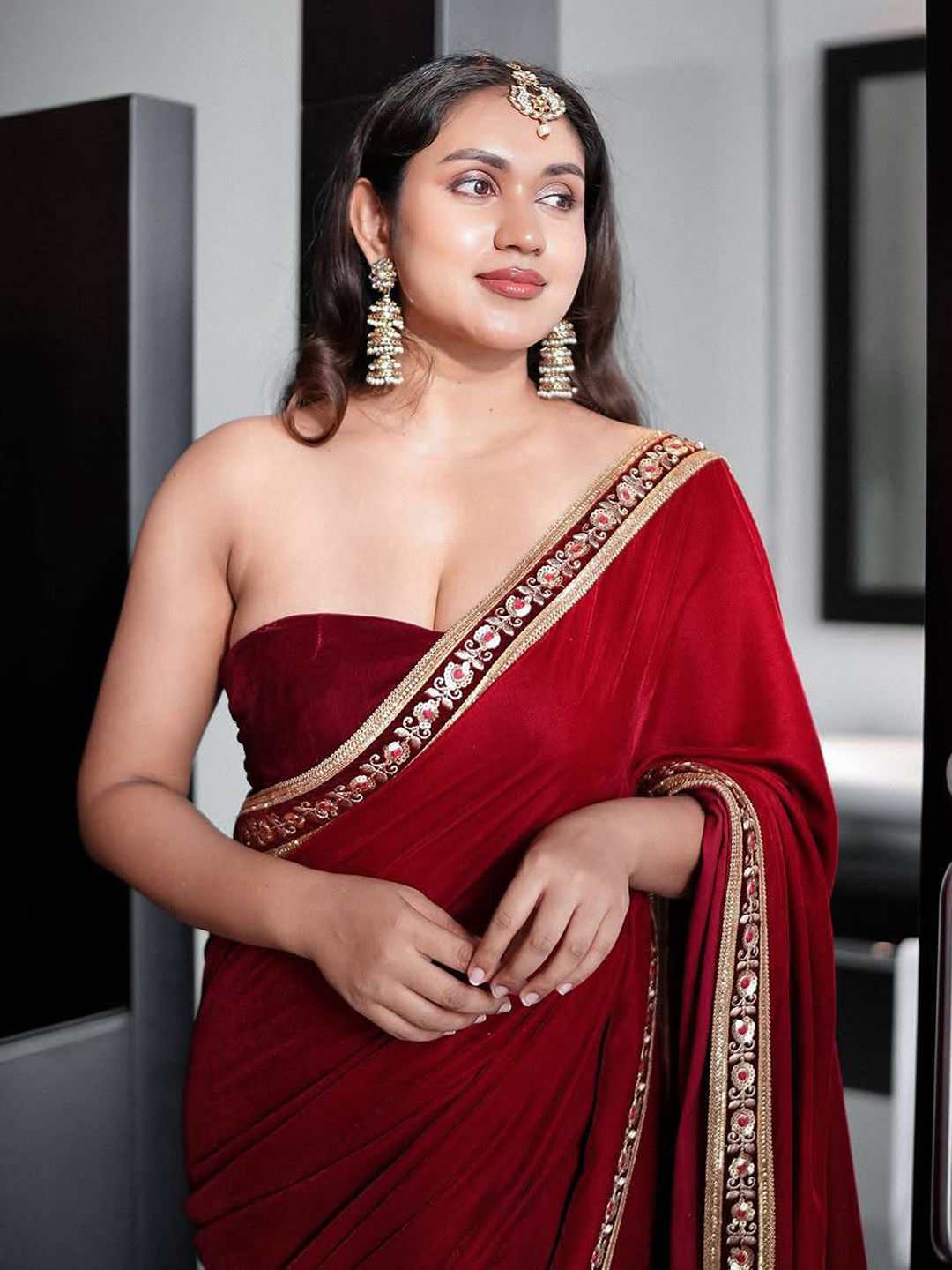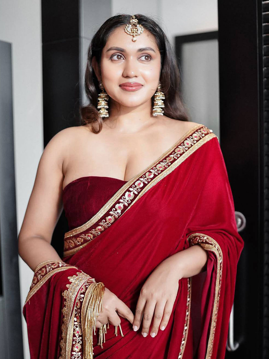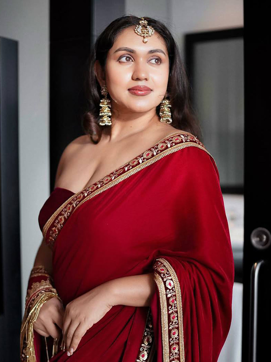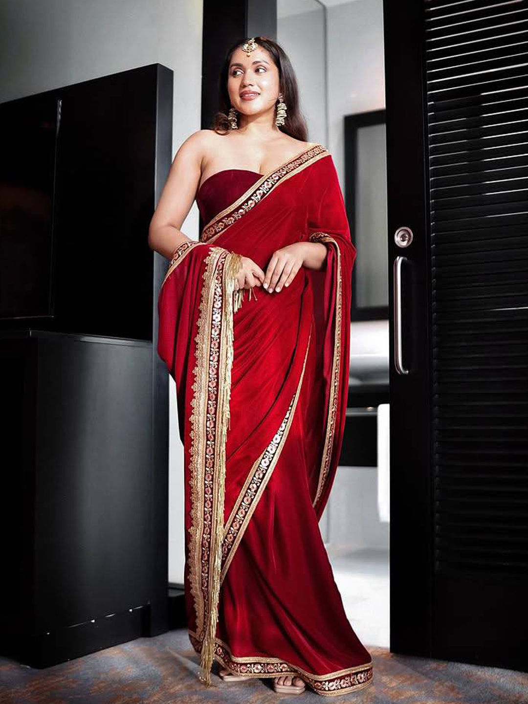 Red and Maroon color Saree in Velvet fabric with Embroidered, Sequence, Thread work