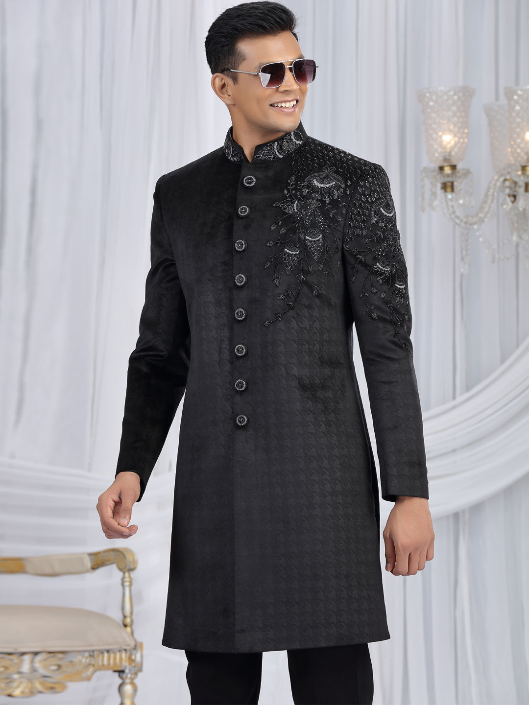 Black and Grey color Sherwani in Velvet fabric with Bugle Beads, Cut Dana, Sequence work