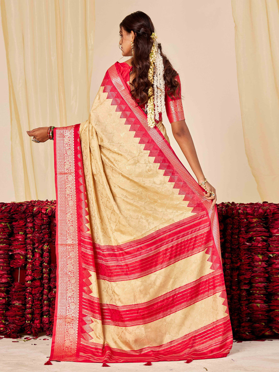 Beige and Brown color Saree in Tussar Silk, Velvet fabric with Printed, Weaving work