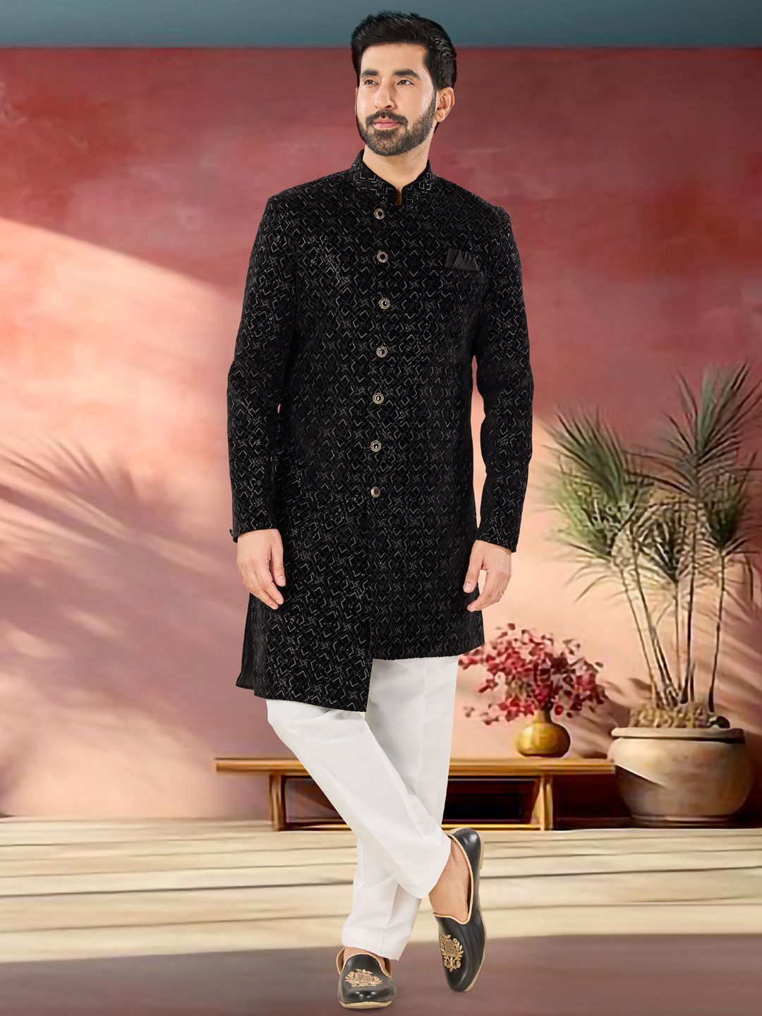 Velvet Reception IndoWestern Dress in Black and Grey with Embroidered work