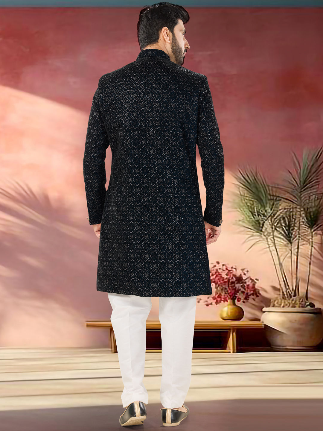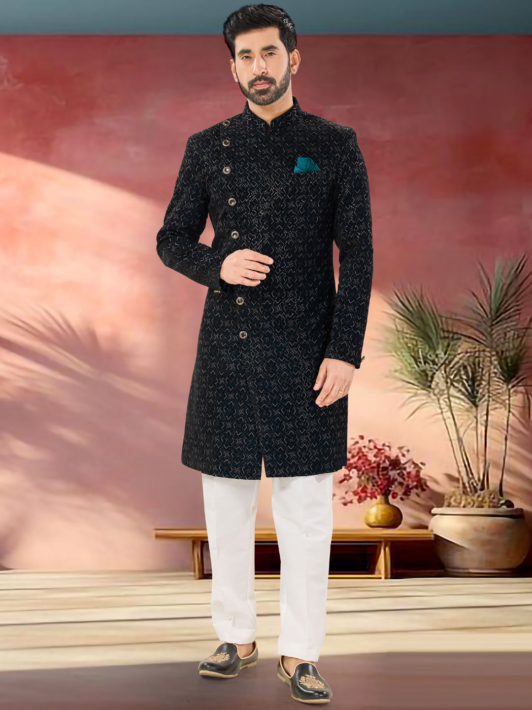 Velvet Wedding IndoWestern Dress in Black and Grey with Thread work