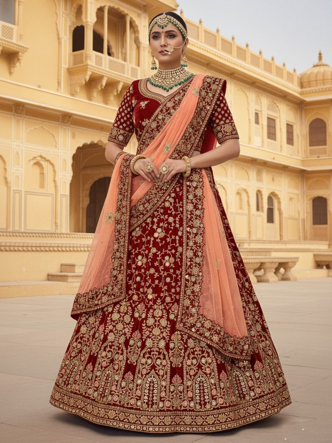 Velvet Bridal Lehenga in Red and Maroon with Embroidered work