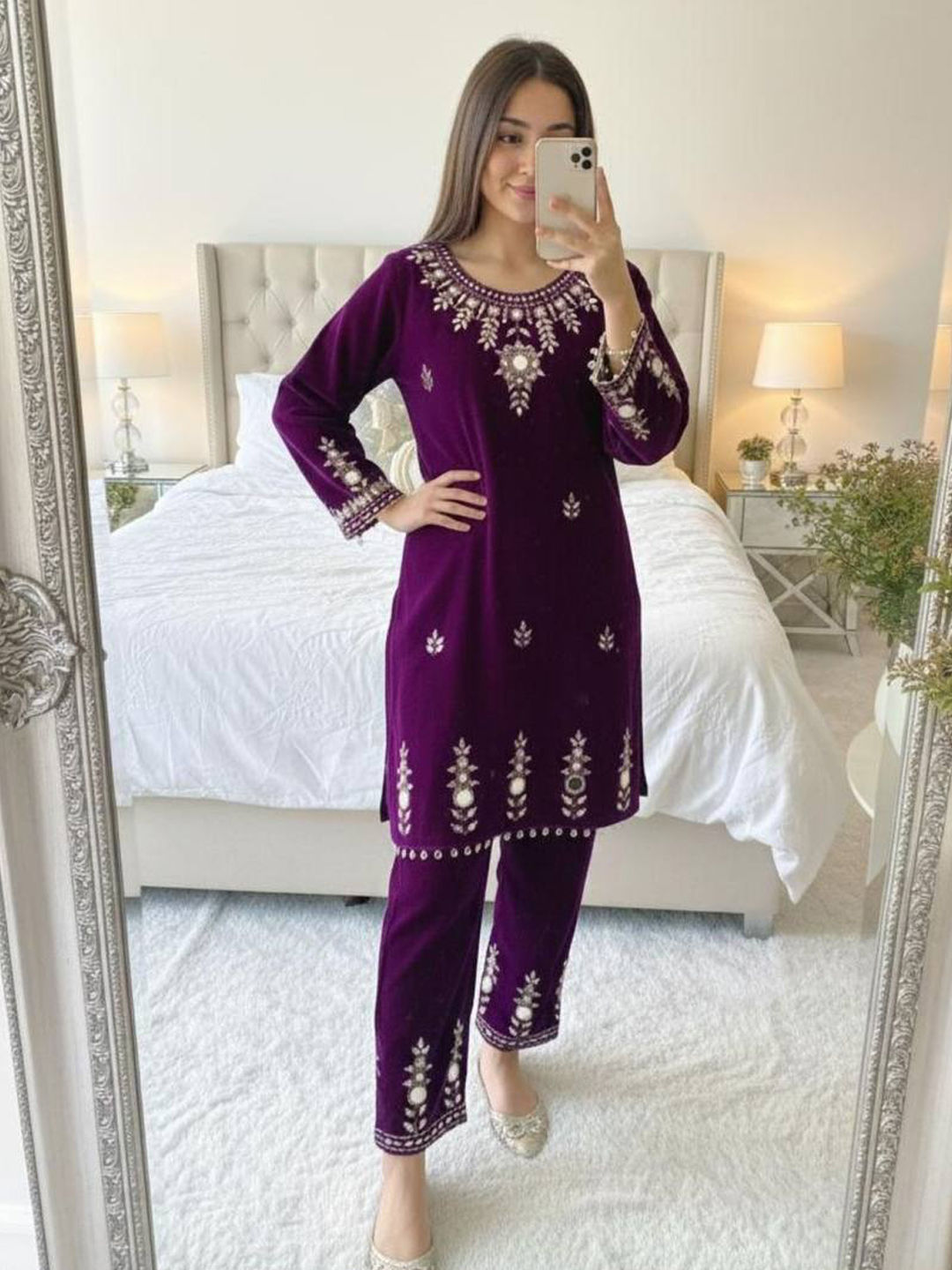 Purple and Violet color Salwar Kameez in Velvet fabric with Embroidered, Sequence, Thread work