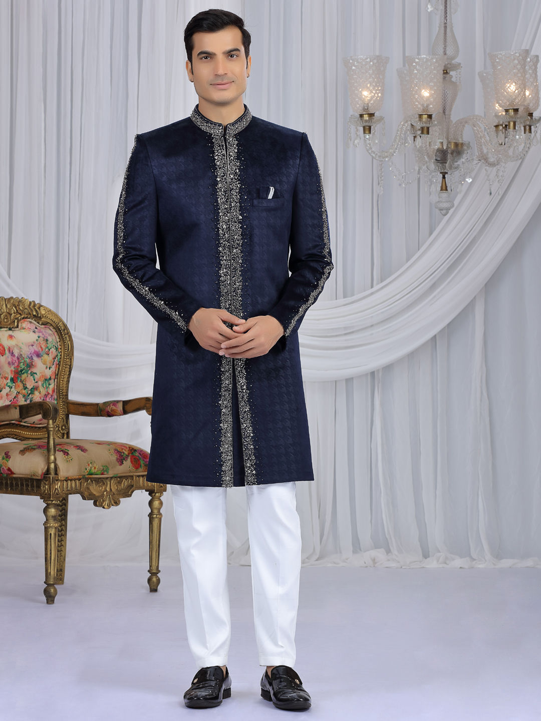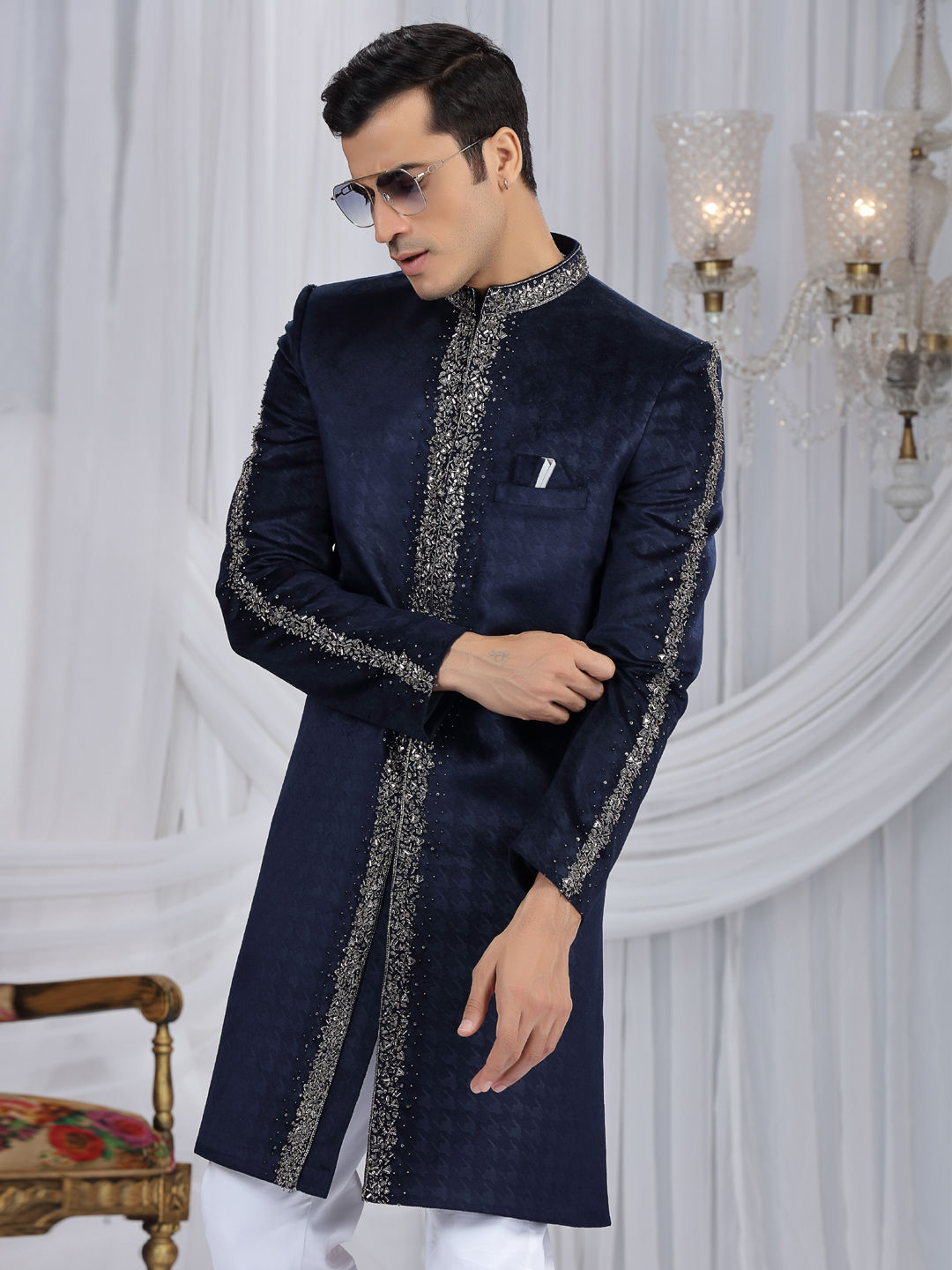 Art Silk Reception Sherwani in Blue with Bugle Beads work