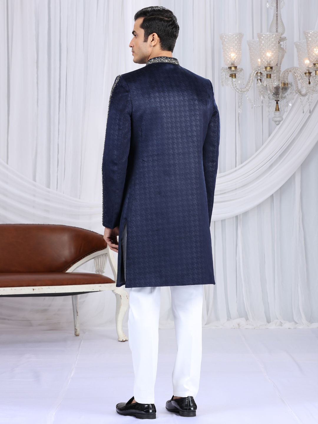 Blue color Sherwani in Velvet fabric with Bugle Beads, Cut Dana, Sequence work